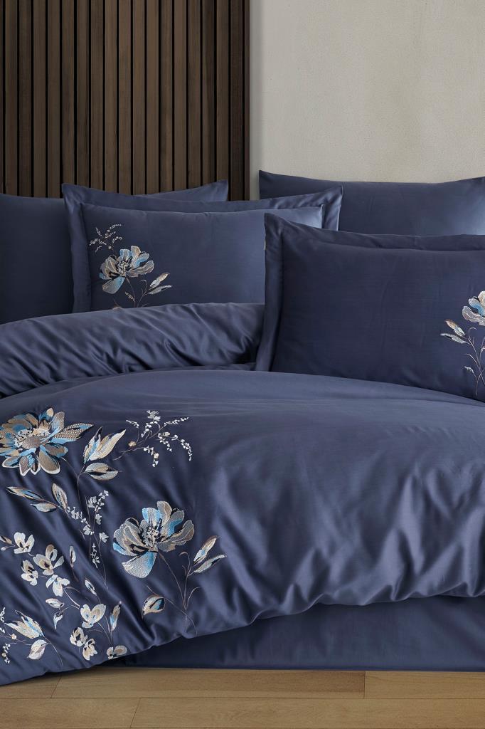 İmpero Nakışlı %100 Pamuk Saten Çift Kişilik Nevresim Takımı Lacivert