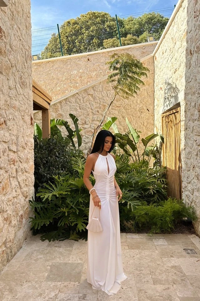 Albertina Low-cut Long Dress It is made of sandy fabric. Size S is used in the image. Dress Length: 155cm Chest: 37cm Waist: 32cm Model Measurements: Height: 160 Weight: 50 Chest: 80 Waist: 62 Hip: 94