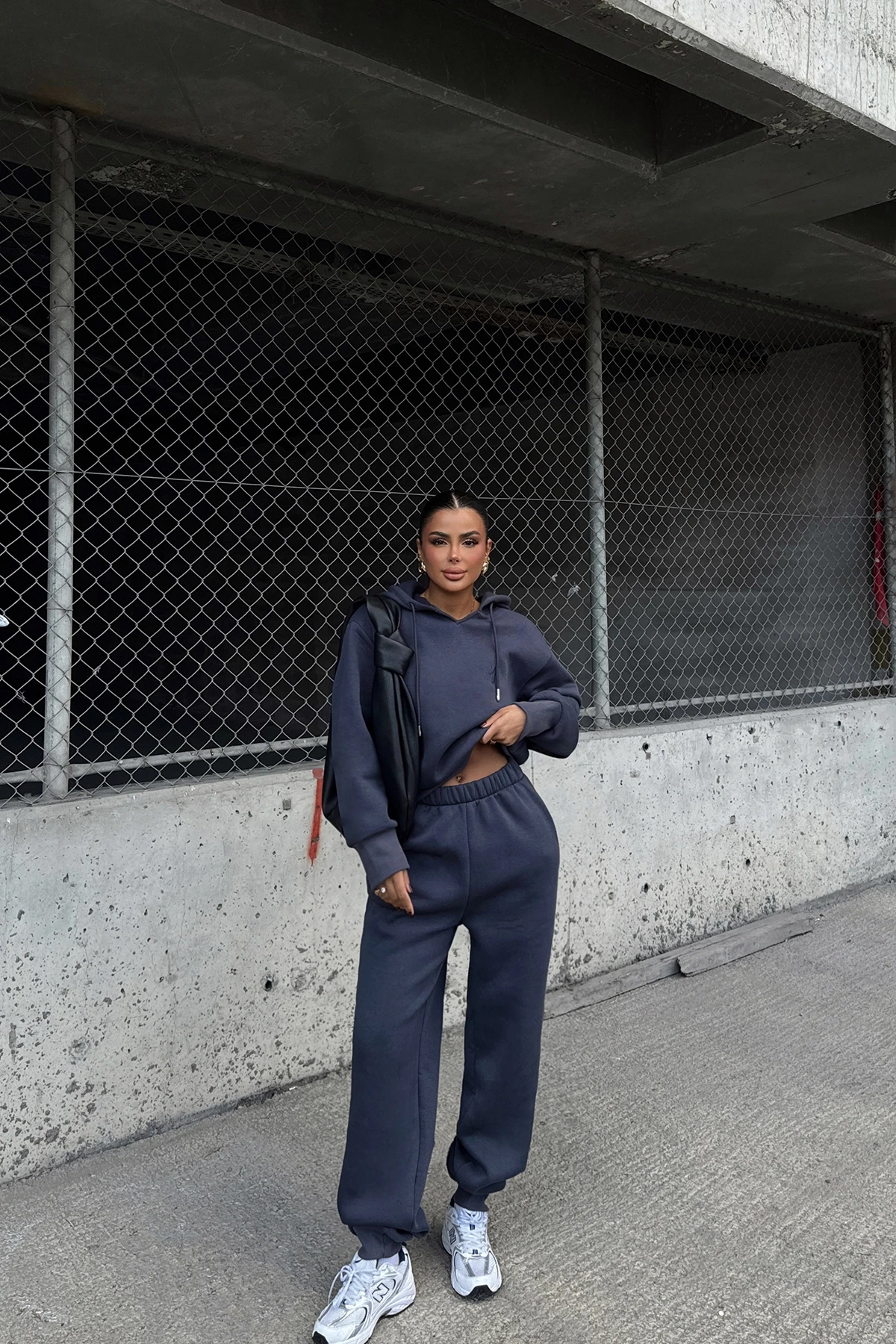 Anthracite Tracksuit Set Size XS is used in the image. Top Length: 55 Cm Bust: 51 Cm Bottom Length: 106 Cm Waist: 37 Cm Made from 3 Thread Fabric. Model Measurements Height 158 Weight 52 Chest 80 Waist 62 Hip 93