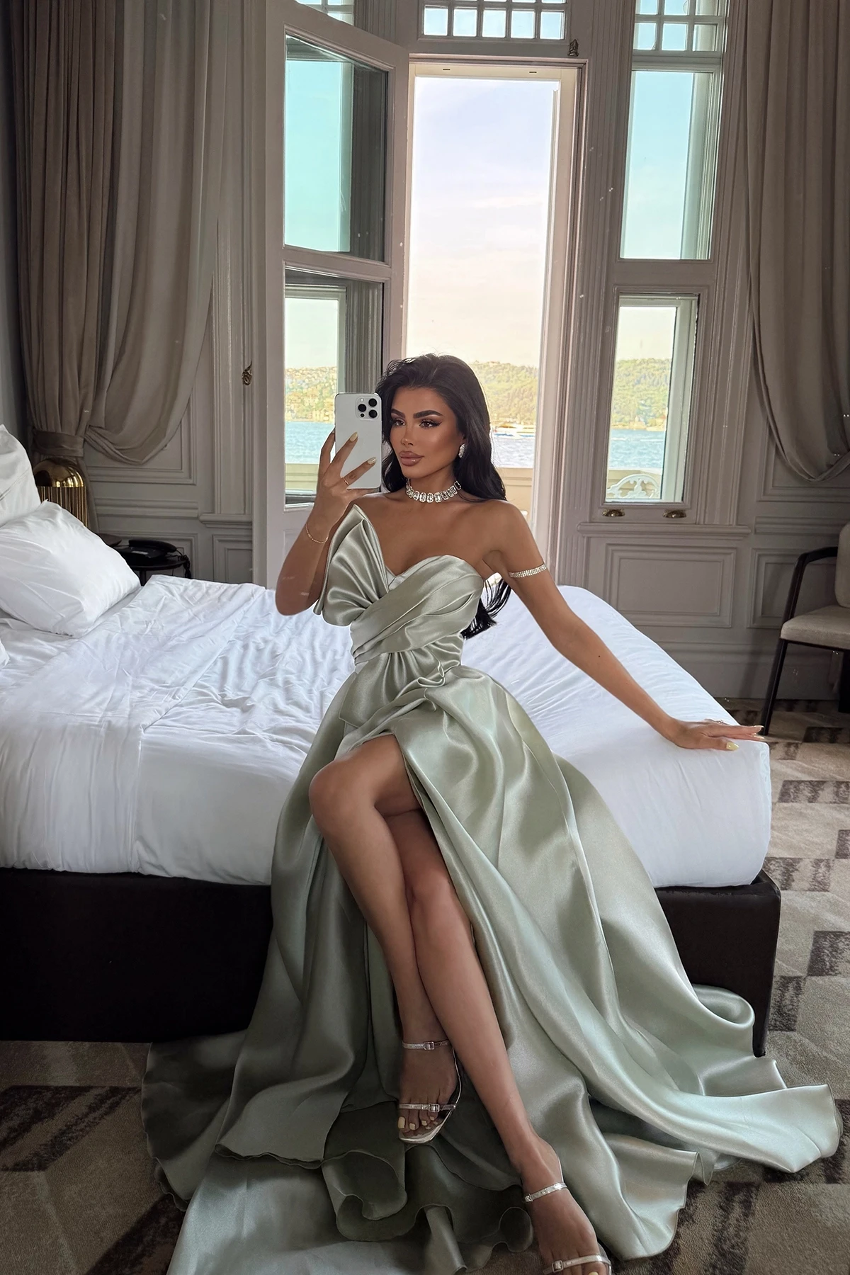Aqua Green Strapless Long Evening Dress In the image, size 36 is used. Height:180 cm Chest:49 cm Waist:37 cm Model Measurements Height 158 Weight 52 Chest 80 Waist 62 Hip 93