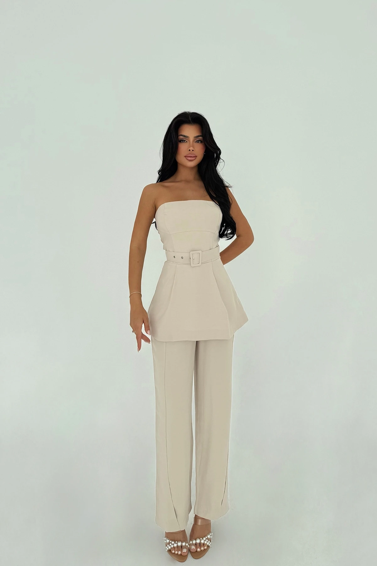 Beige Betty Belted Suit XS size is used in the image. Made of Padova Fabric. Upper Length: 54 cm Chest: 37 cm Lower Length: 102 cm Waist: 36 cm Model Measurements Height 158 Weight 52 Chest 80 Waist 62 Hip 93