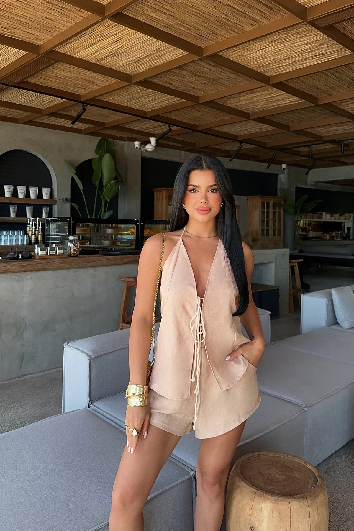 Beige Candida Linen Set Made from linen fabric. Size S is used in the image. Top length: 52 cm, Chest 36, Waist 28 cm, Bottom length 42 cm Model Measurements: Height: 160 Weight: 50 Chest: 80 Waist: 62 Hip: 94