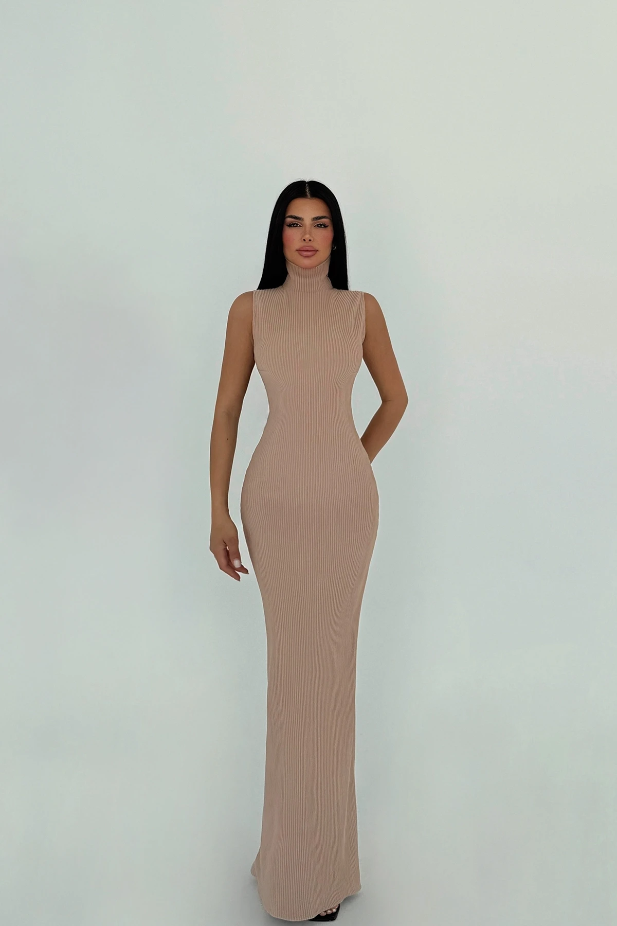Beige Jila Long Dress The image uses size XS. Length: 142 cm Waist: 40 cm Chest: 43 cm Model Measurements Height 158 Weight 52 Chest 80 Waist 62 Hip 93