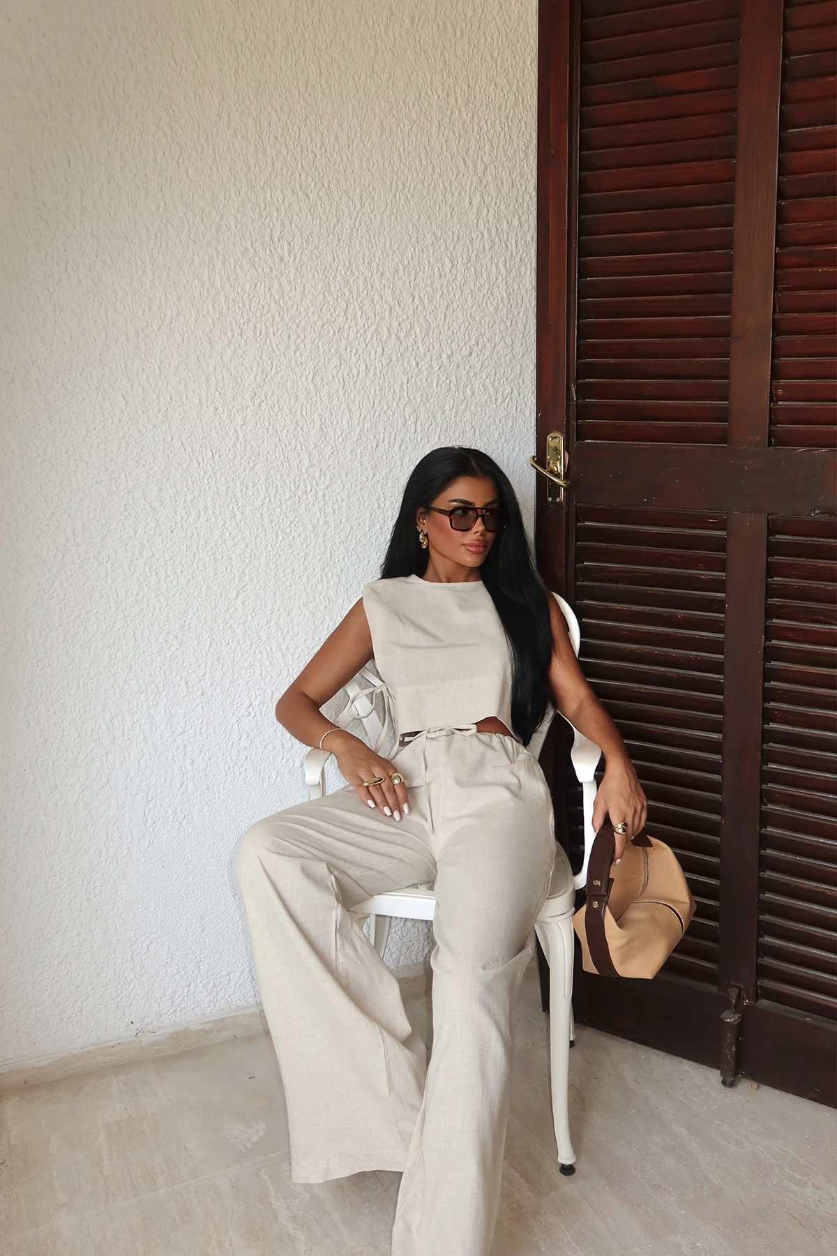 Beige Lali Two Piece Suit Size XS is used in the image. Made from linen fabric. Bottom Length: 109 Cm, Top Length: 38 Cm Bust: 37 Cm, Waist: 43 Cm Model Measurements Height 158 Weight 52 Chest 80 Waist 62 Hip 93