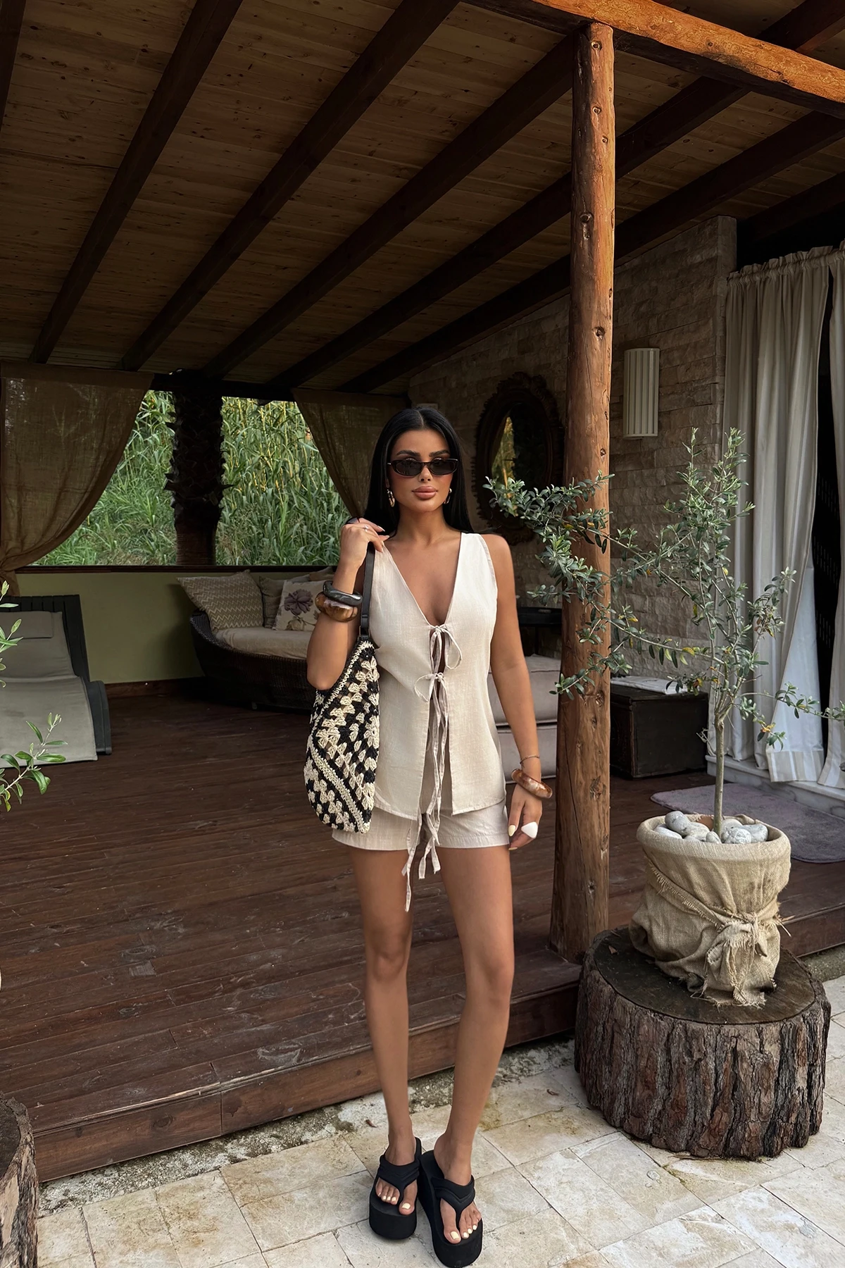 Beige Luiza Mini Linen Tie Set XS size is used in the image. Made of Filamented Linen Fabric. Top Length: 63 cm Chest: 44 cm Bottom Length: 36 cm Waist: 40 cm Model Measurements Height 158 Weight 52 Chest 80 Waist 62 Hip 93