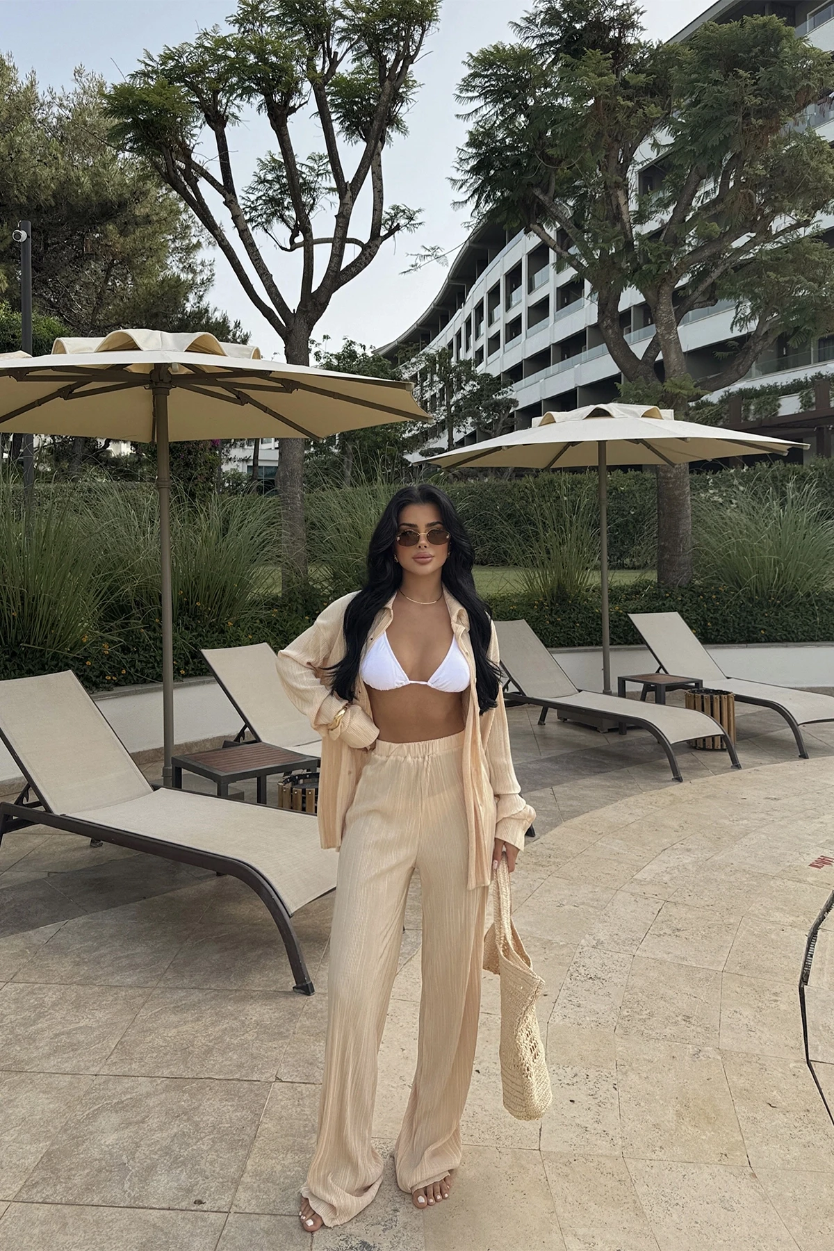 Beige Wilma Set It is made of pleated fabric. Size S is used in the image. Suit top length 69 cm, Chest 54 cm, Bottom length 113 cm, Waist 36 cm Model Measurements: Height: 160 Weight: 50 Chest: 80 Waist: 62 Hip: 94