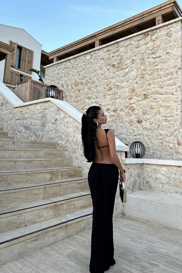 Black Antonella Dress with Low-cut Back and Accessories Size S is used in the image. Made from Sandy Fabric Dress Length: 164cm Chest: 36cm Hip: 37cm Model Measurements: Height: 160 Weight: 50 Chest: 80 Waist: 62 Hip: 94