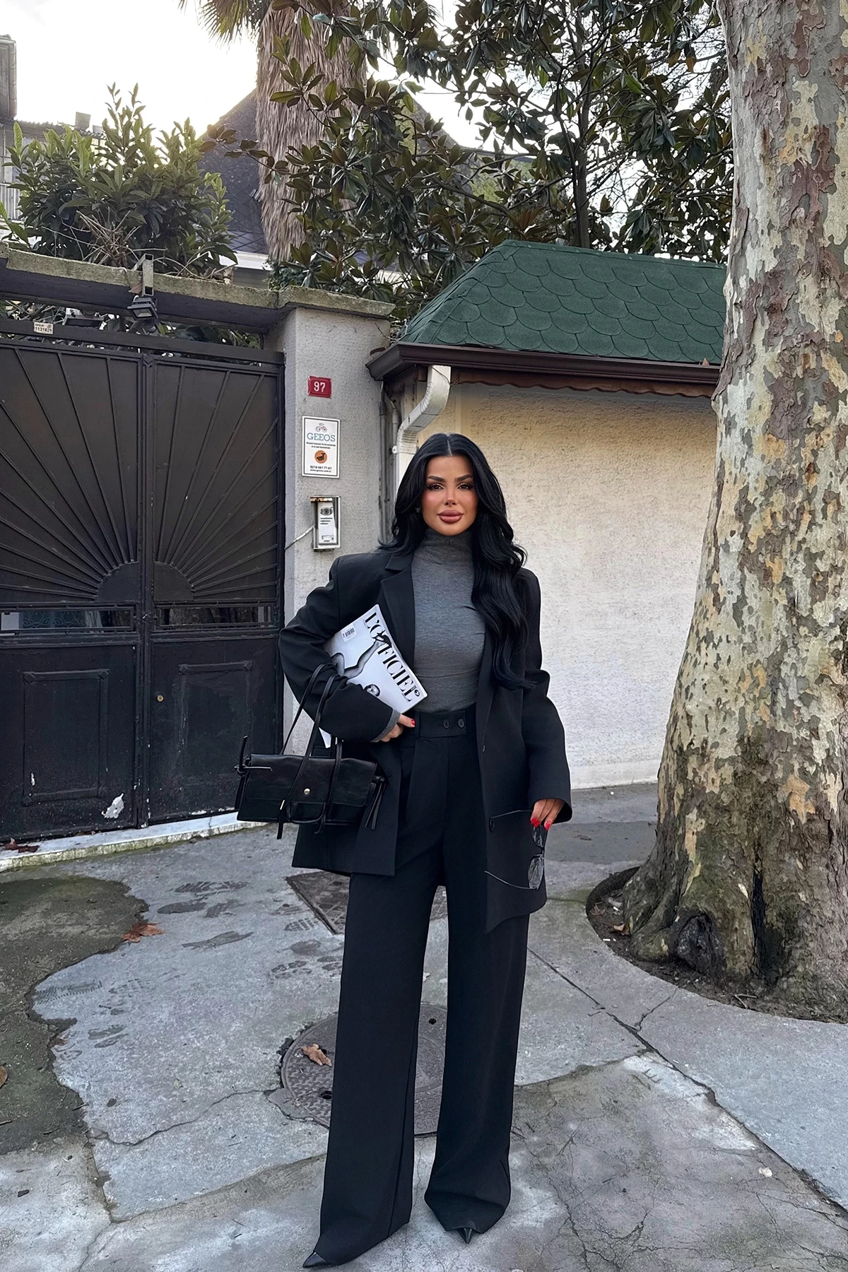 Black Button Detailed Trousers Suit Size XS is used in the image. Suit Top Length:84 Cm Chest:52 Cm Bottom Length:108 Cm Waist:34 Cm Model Measurements Height 158 Weight 52 Chest 80 Waist 62 Hip 93