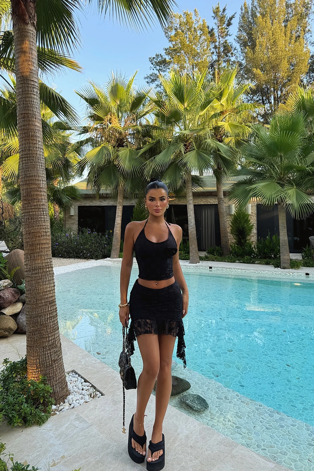 Black Skirt Suit Size S is used in the image. It is made of lace fabric. Suit Top Length 36 cm, Chest 29 cm, Bottom Length 40 cm, Waist 30 cm Model Measurements: Height: 160 Weight: 50 Chest: 80 Waist: 62 Hip: 94