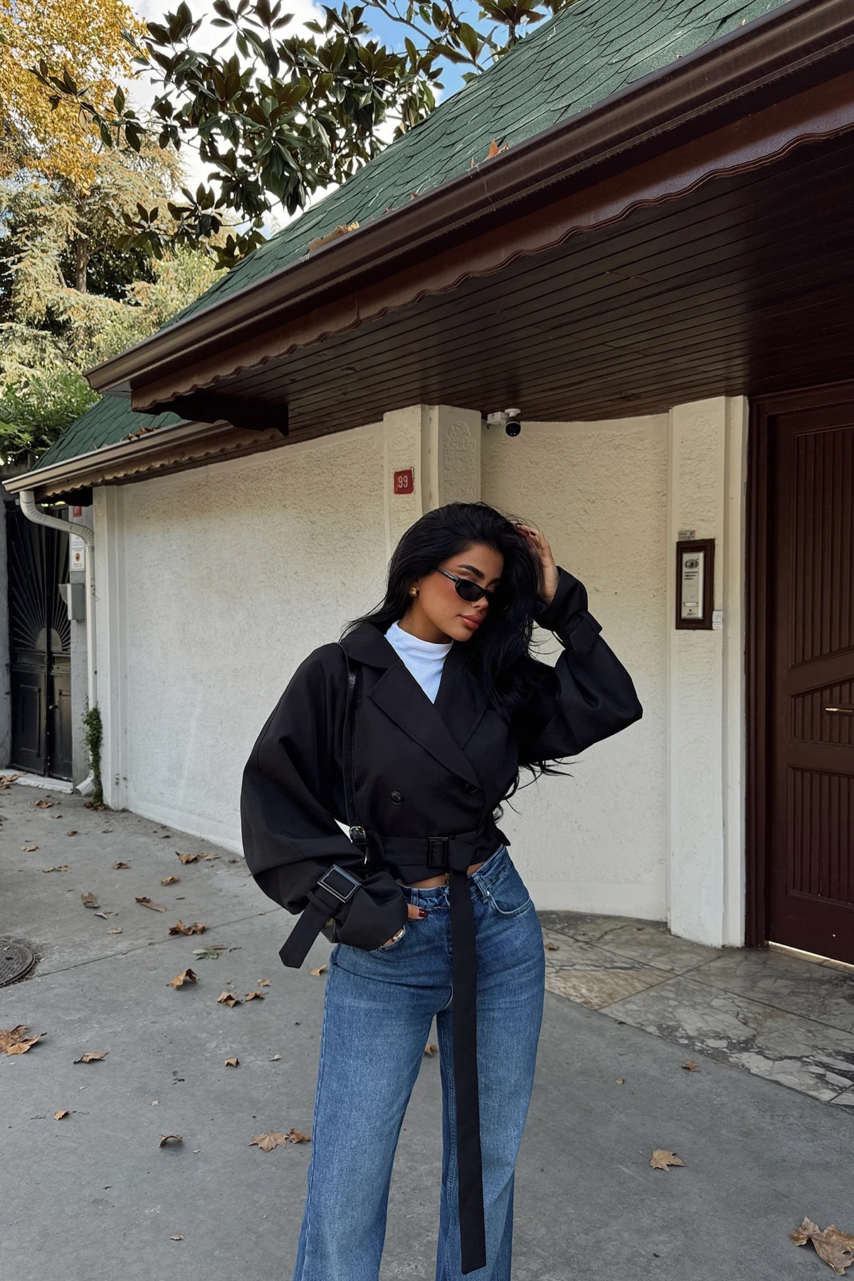 Black Double Breasted Collar Jacket Size XS is used in the image. Height: 48 cm Bust: 51 cm Model Measurements Height 158 ​​Weight 52 Chest 80 Waist 62 Hip 93