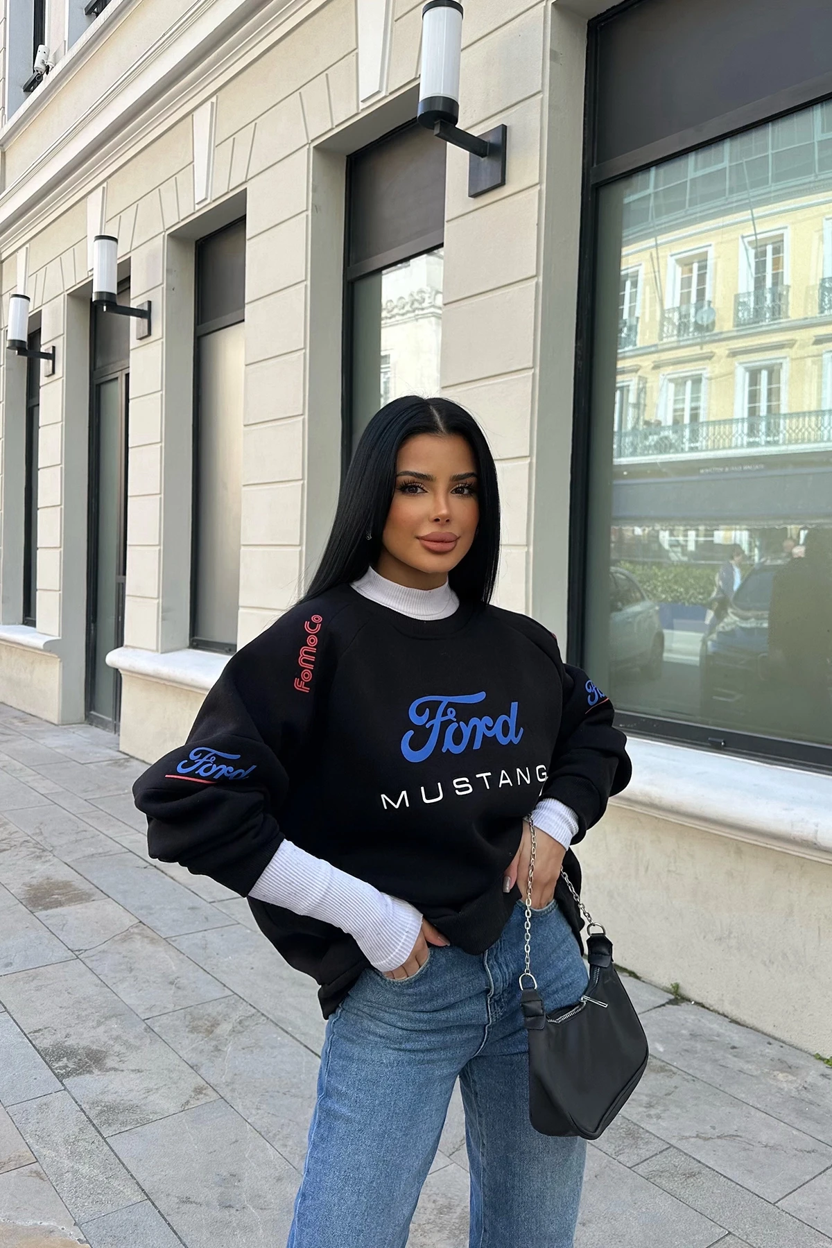 Black Ford Mustang Written Sweat Made from Three Thread Fabric Size S is used in the image Sweat Length:68cm Chest:63cm Model Measurements: Height: 160 Weight: 50 Chest: 80 Waist: 62 Hip: 94