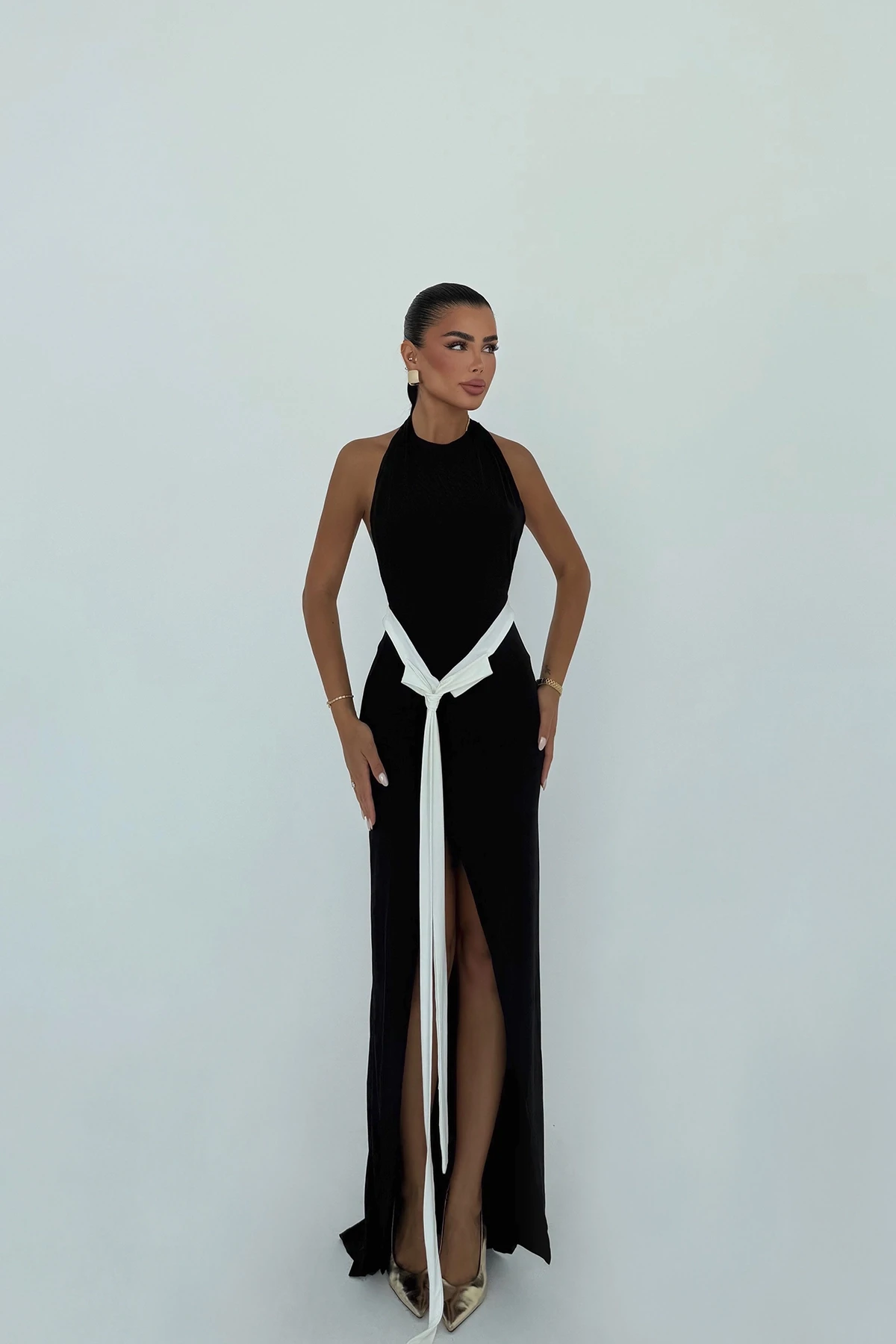 Black Front Tie Long Dress XS size is used in the image. Made of Sandy Fabric. Height: 148 cm Waist: 29 cm Chest: 26 cm Model Measurements Height: 160 Weight: 50 Chest: 80 Waist: 62 Hip: 94