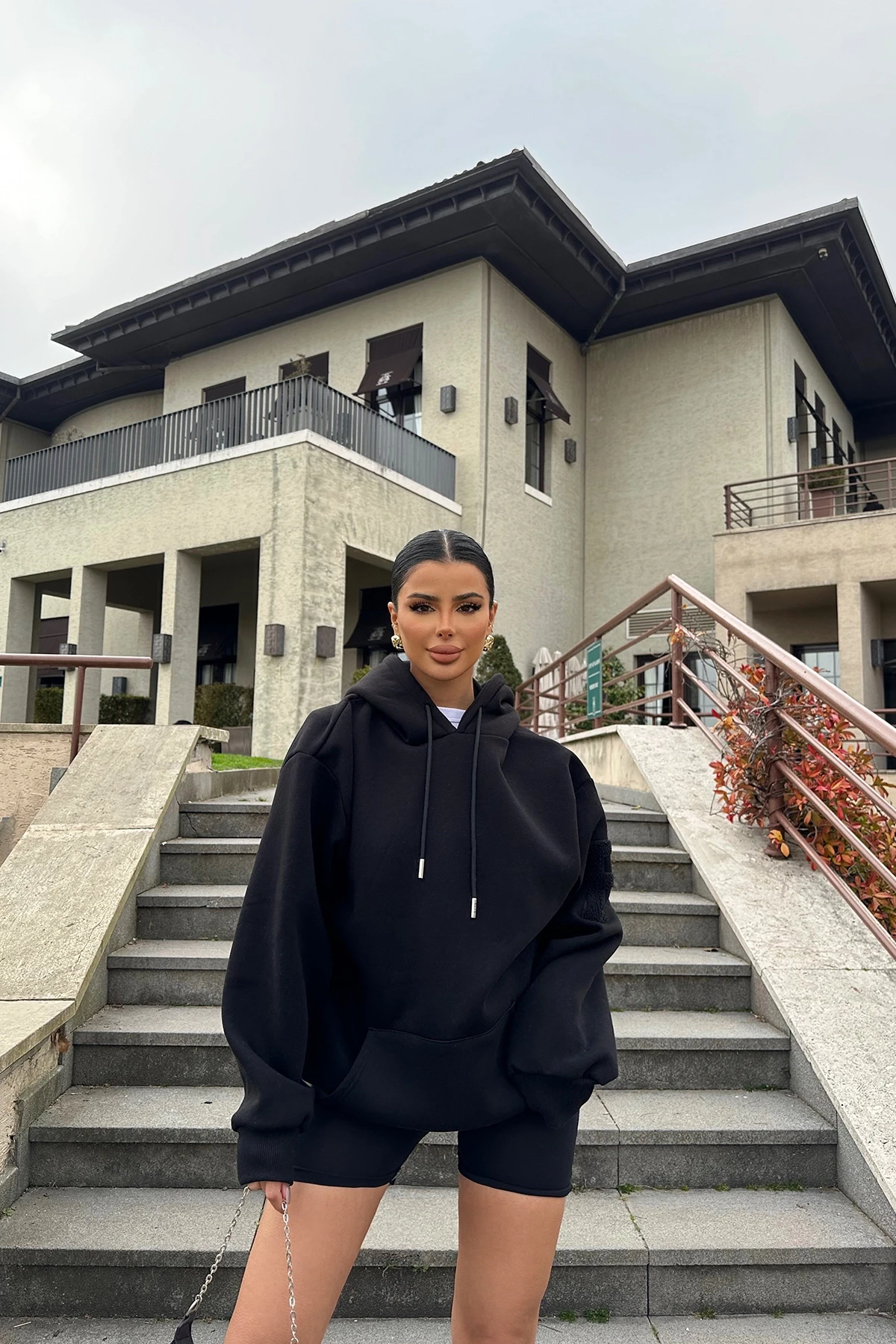 Black Hooded E Embroidered Sweat Made from Three Thread Fabric Size S is used in the image Sweat Length:70cm Chest:60cm Model Measurements: Height: 160 Weight: 50 Chest: 80 Waist: 62 Hip: 94