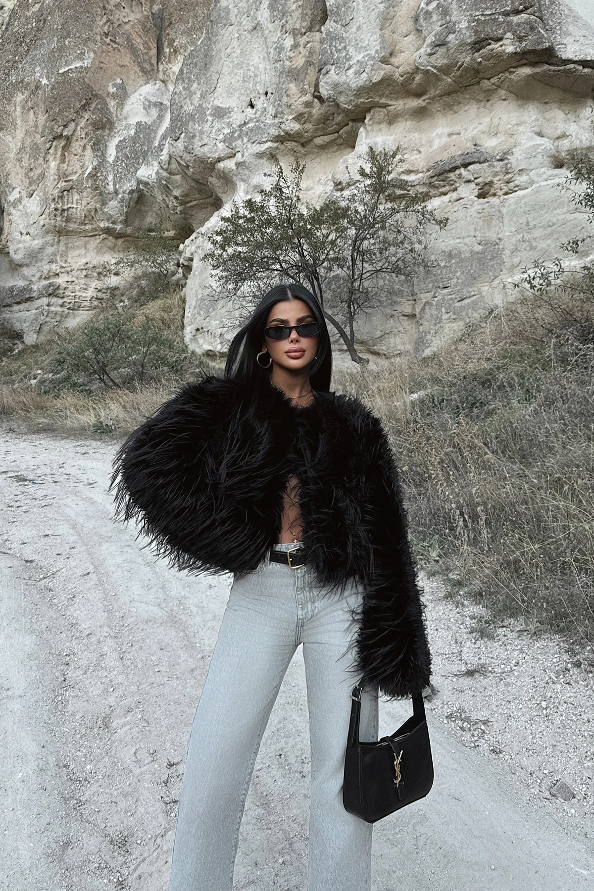 Black Leroy Fur Size XS is used in the image. Made from Imported Fur. Fur Length: 52 Cm Chest: 50 Cm Model Measurements Height 158 Weight 52 Chest 80 Waist 62 Hip 93