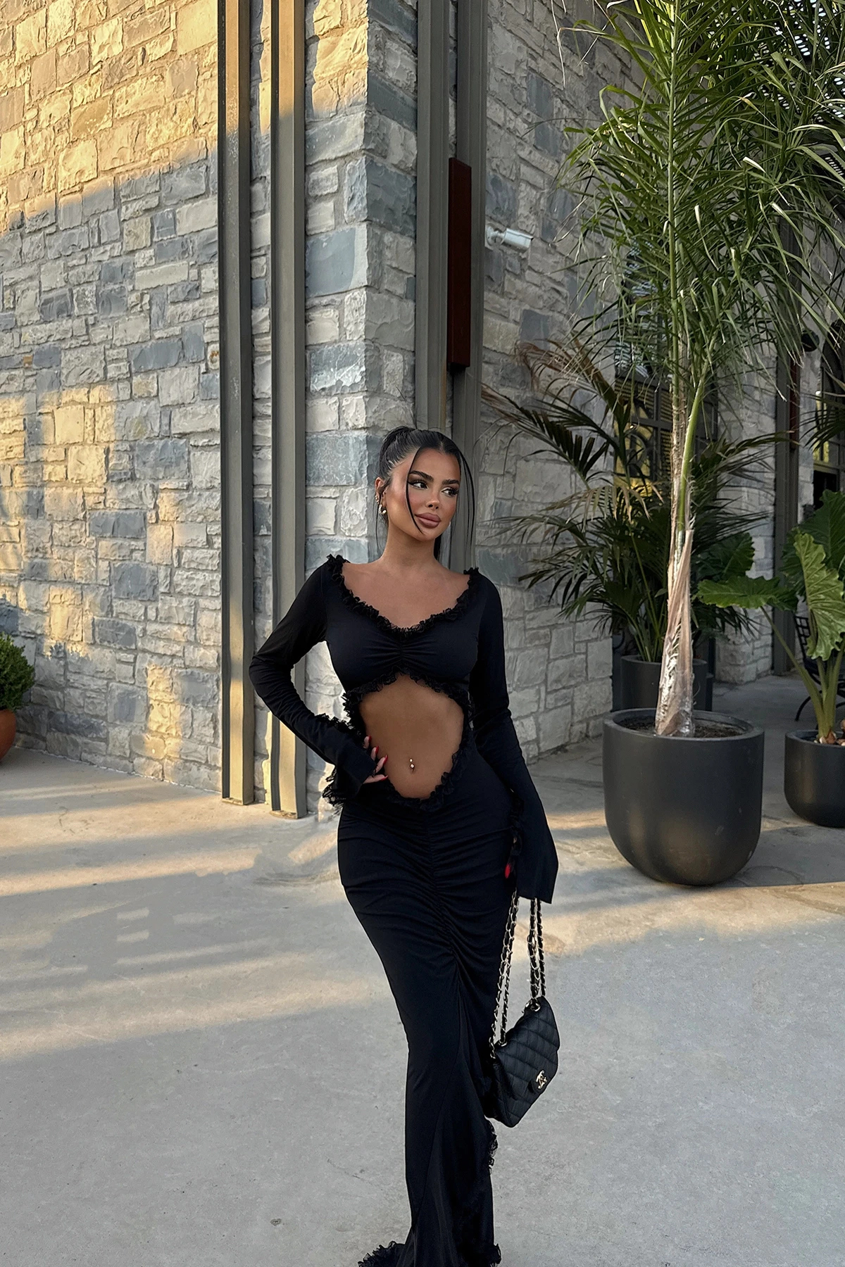 Black Window Detail Long Dress It is made of sandy fabric. Size S is used in the image. Dress Length: 139 Cm, Chest: 35 Cm, ​​Waist: 23 Cm, Hip: 37 Cm Model Measurements: Height: 160 Weight: 50 Chest: 80 Waist: 62 Hip: 94