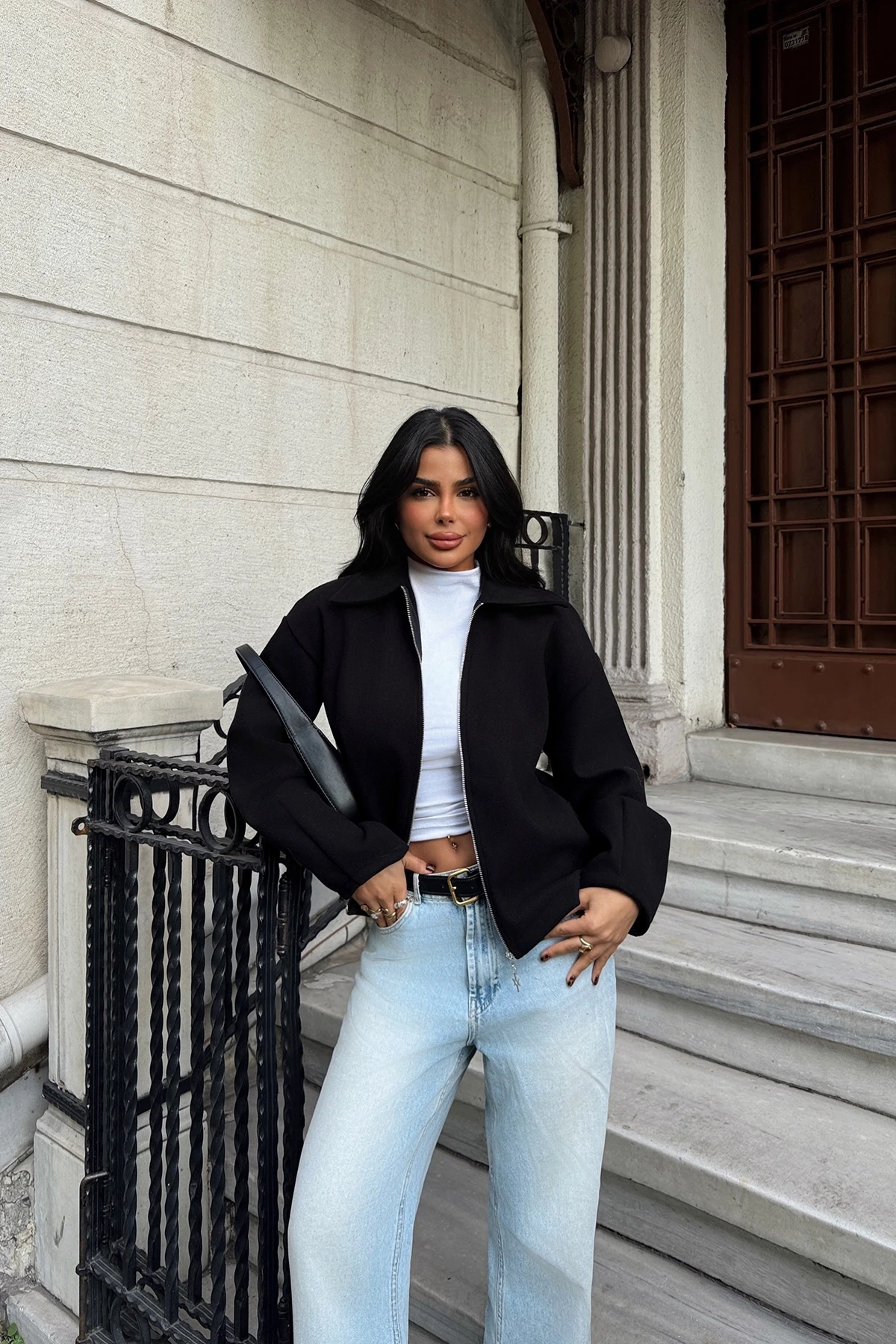 Black Minato Jacket Size XS is used in the image. Made from Stamped Fabric. Height: 62 cm Bust: 53 Model Measurements Height 158 Weight 52 Chest 80 Waist 62 Hip 93