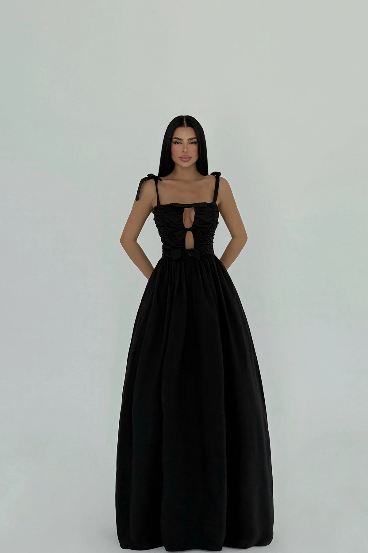 Black Mirabelle Long Dress Made of Poplin Fabric. Length: 120 cm Waist: 32 cm Chest: 40 cm XS size is used in the image. Model Measurements Height 158 Weight 52 Chest 80 Waist 62 Hip 93