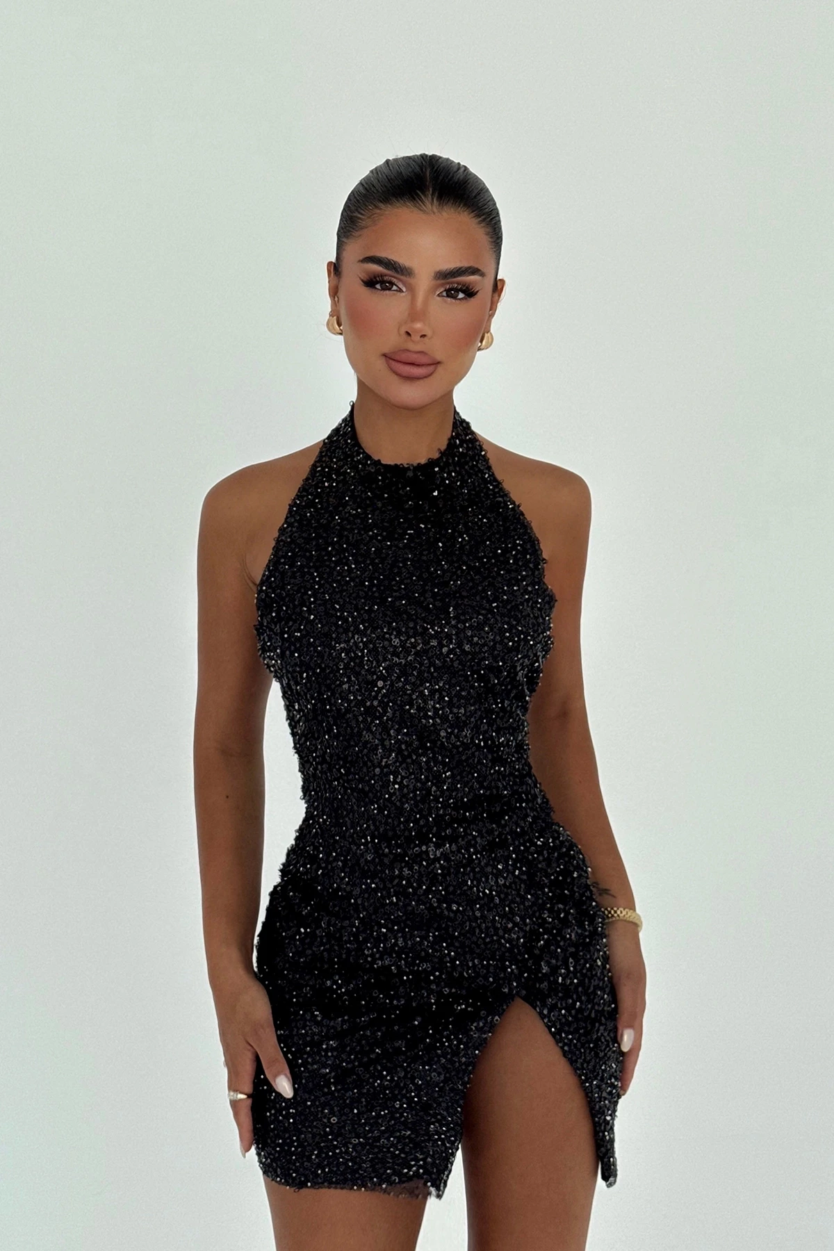 Black Nateba Mini Dress XS size is used in the image. Made of Sequin Fabric. Length: 82 cm Waist: 31 cm Chest: 34 cm Model Measurements Height 158 Weight 52 Chest 80 Waist 62 Hip 93