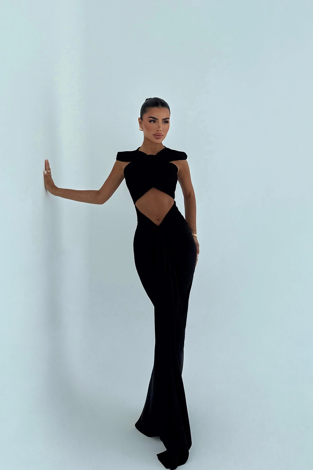 Black Orleans Long Dress The image shows size XS. Height: 155 cm Waist: 27 cm Chest: 35 cm Model Measurements Height: 160 Weight: 50 Chest: 80 Waist: 62 Hip: 94