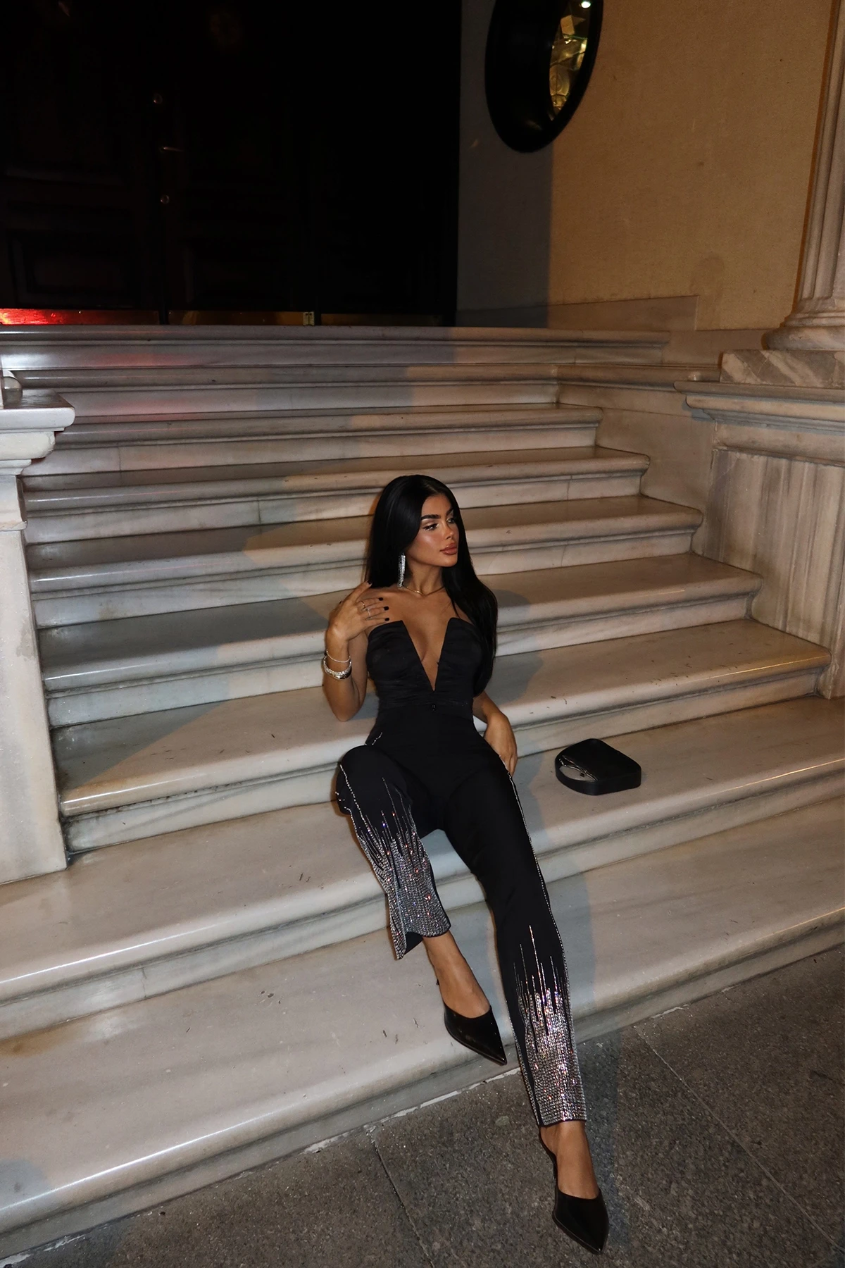 Black Peta Stone Glitter Pants Made of Double Fabric. XS Size Used in the Image. Height:96 Cm Waist:37 Cm Model Measurements Height 158 Weight 52 Chest 80 Waist 62 Hip 93