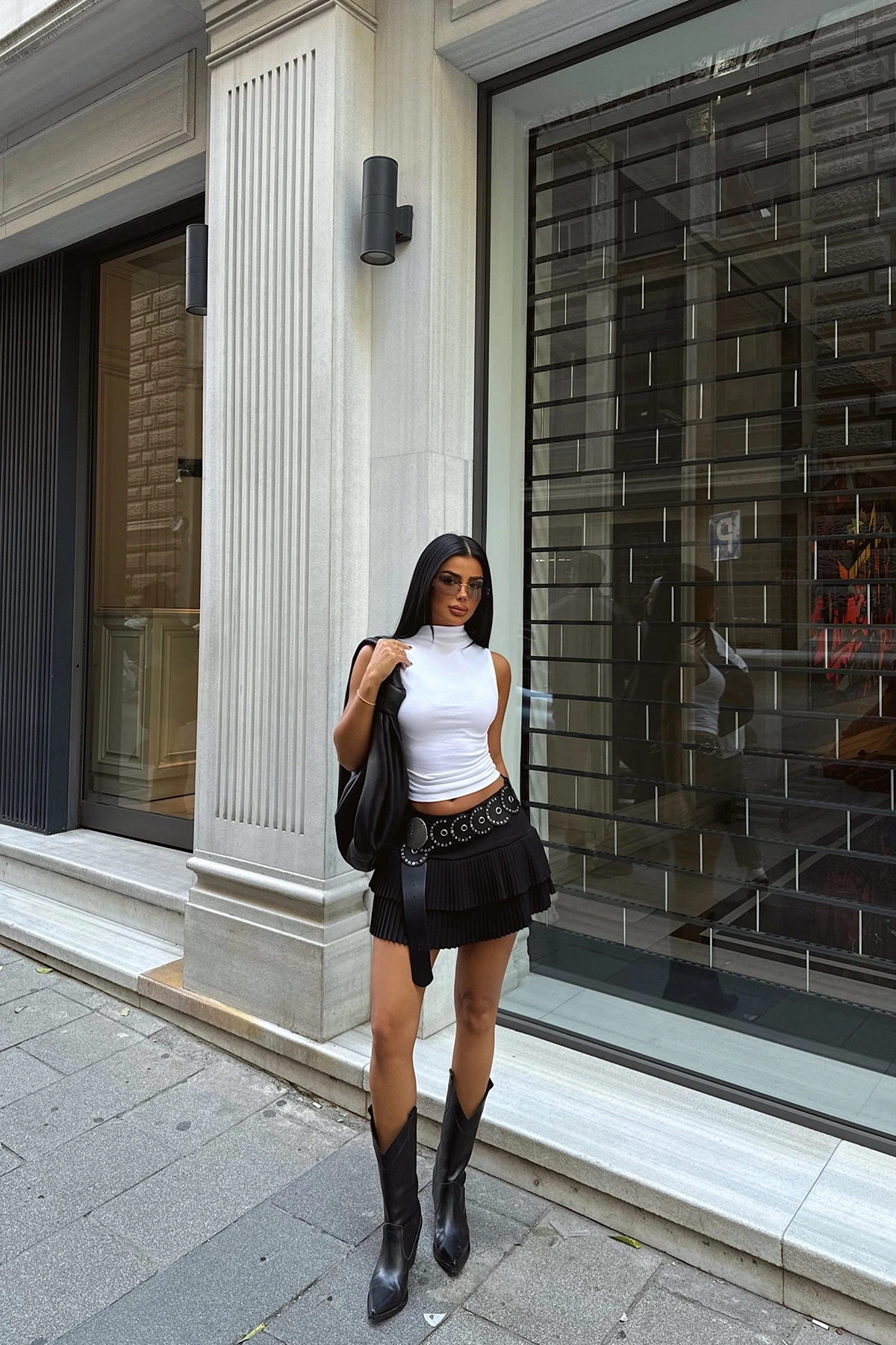 Black Pleated Mini Skirt Size S is used in the image. Made of double fabric. Length 30 cm, Waist 40 cm Model Measurements Height: 160 Weight: 50 Chest: 80 Waist: 62 Hip: 94