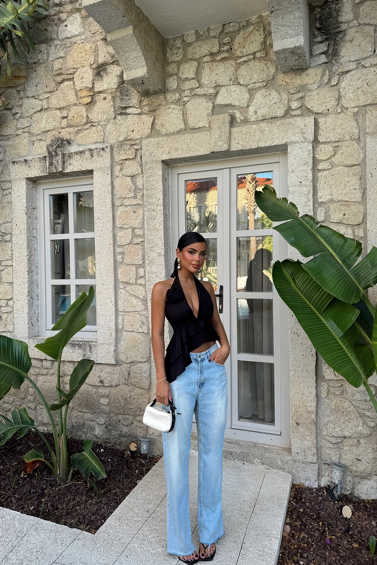 Black Rose Detail Tied Crop Image S size used Crop Length: 87 cm Chest: 24 cm Model Measurements Height: 171 Weight: 55 Chest: 85 Waist: 65 Hip: 105