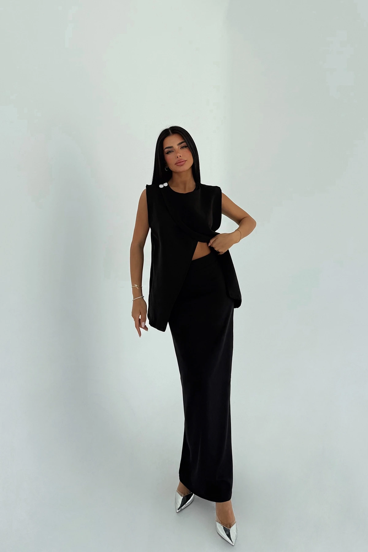 Black Salvatore Suit XS size is used in the image. Top Length: 65 cm Chest: 97 cm Bottom Length: 89 cm Waist: 37 cm Model Measurements Height 158 Weight 52 Chest 80 Waist 62 Hip 93