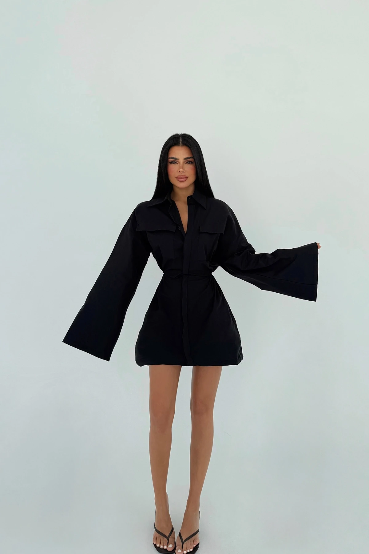Black Shirt Collar Dress XS size is used in the image. Made of Poplin Fabric. Length: 92 cm Waist: 43 cm Chest: 53 cm Model Measurements Height 158 Weight 52 Chest 80 Waist 62 Hip 93