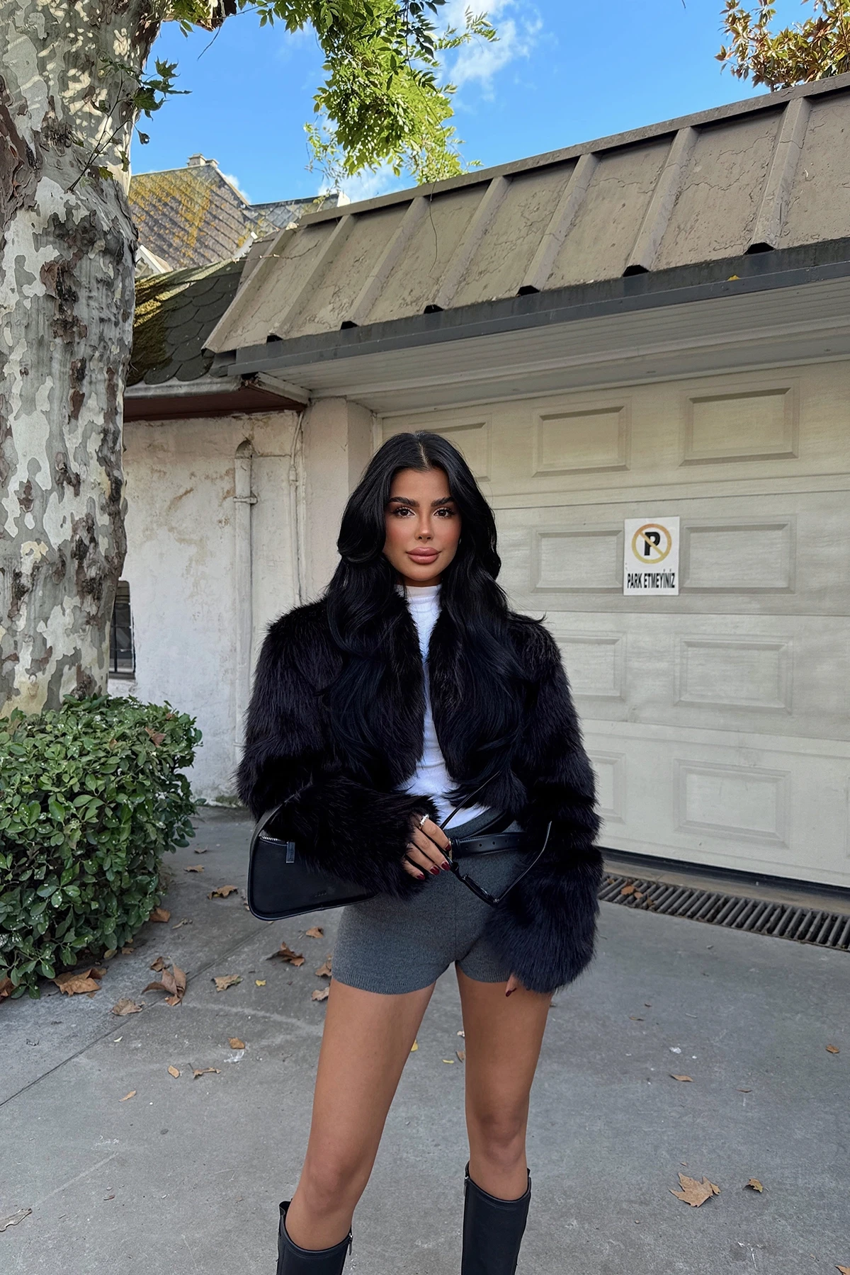 Black Short Fur The image uses size XS. Height:36 cm Chest:51 cm Model Measurements Height 158 Weight 52 Chest 80 Waist 62 Hip 93