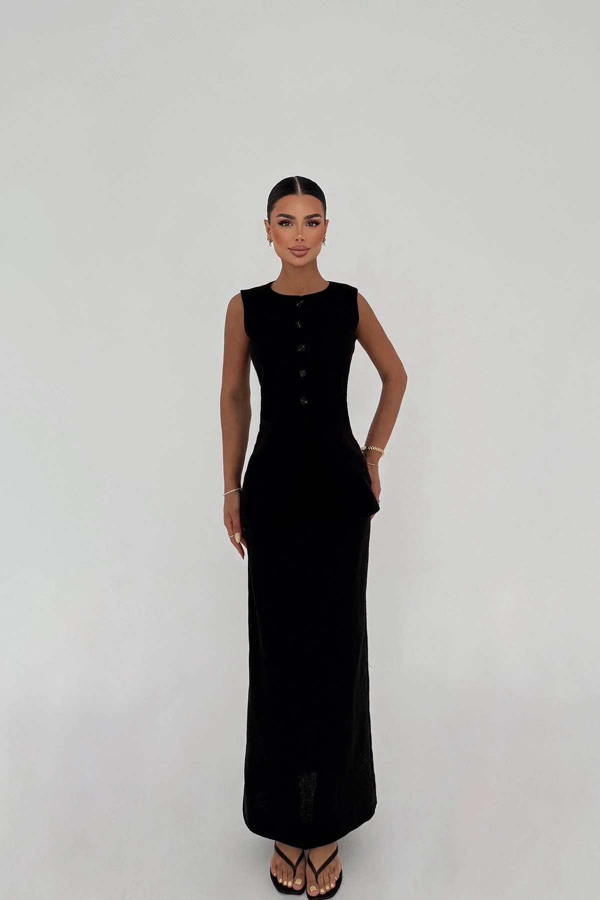 Black Skirt Suit XS size is used in the image. Made of Suzi Linen Fabric. Top Length: 67 cm Chest: 44 cm Bottom Length: 96 cm Waist: 34 cm Model Measurements Height 158 Weight 52 Chest 80 Waist 62 Hip 93