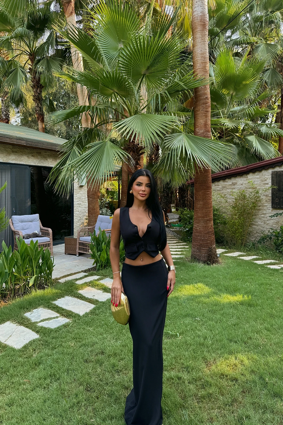 Black Skirt Suit Size S is used in the image. Made of crepe fabric. Suit Top Length 43 cm, Chest 36 cm, Bottom Length 100 cm, Waist 39 cm Model Measurements Height: 160 Weight: 50 Chest: 80 Waist: 62 Hip: 94