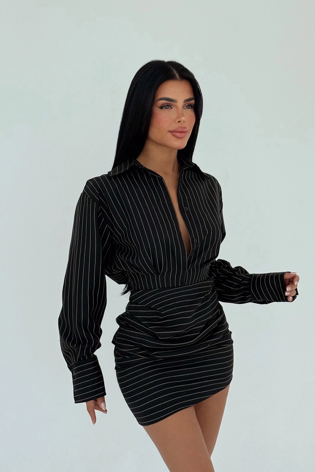 Black Striped Shirt Collar Mini Dress The image uses size XS. Length: 82 cm Waist: 36 cm Chest: 44 cm Model Measurements Height 158 ​​Weight 52 Chest 80 Waist 62 Hip 93