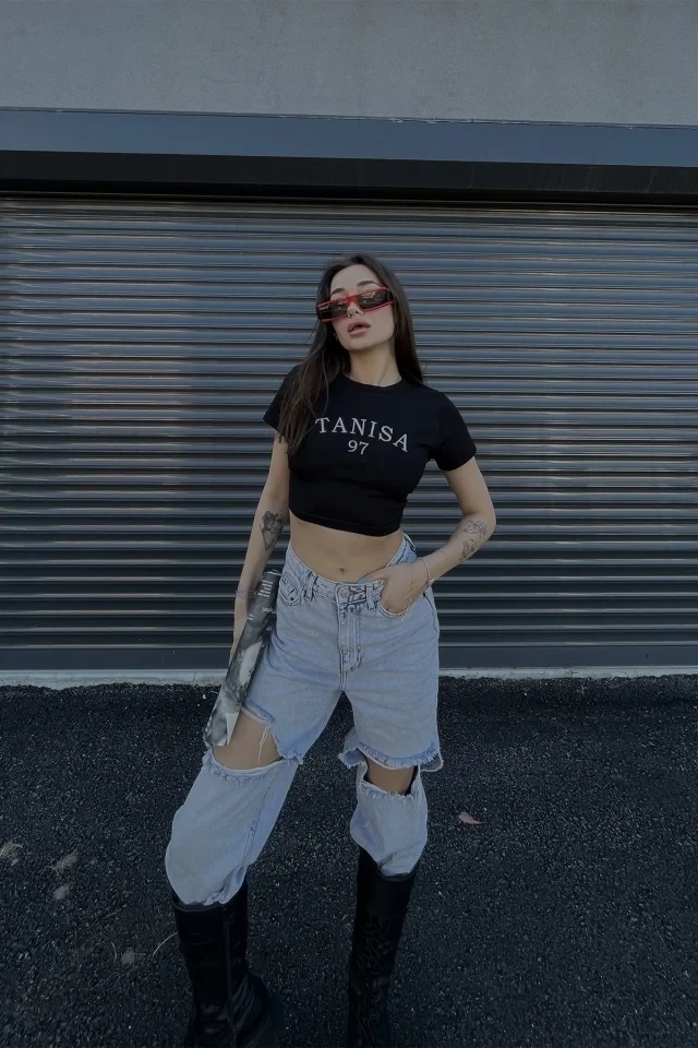 Black Tanisa Written Crop Top Size S is used in the image. Crop length is 40 cm, chest is 45 cm. Model Measurements: Height: 167 Weight: 52 Chest: 79 Waist: 62 Hip: 94
