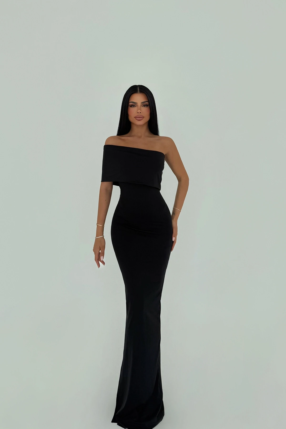 Black Vanya One Sleeve Dress XS size is used in the image. Made of Sandy Fabric. Length: 133 cm Waist: 31 cm Chest: 34 cm Model Measurements Height 158 Weight 52 Chest 80 Waist 62 Hip 93