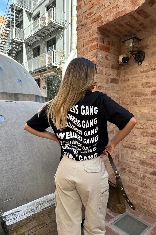 Black Wellness Gang Printed T-Shirt It is made of combed cotton fabric. Size S is used in the image. T-shirt length is 75 cm, chest is 60 cm. Model Measurements: Height: 171 Weight: 55 Chest: 85 Waist: 65 Hip: 105