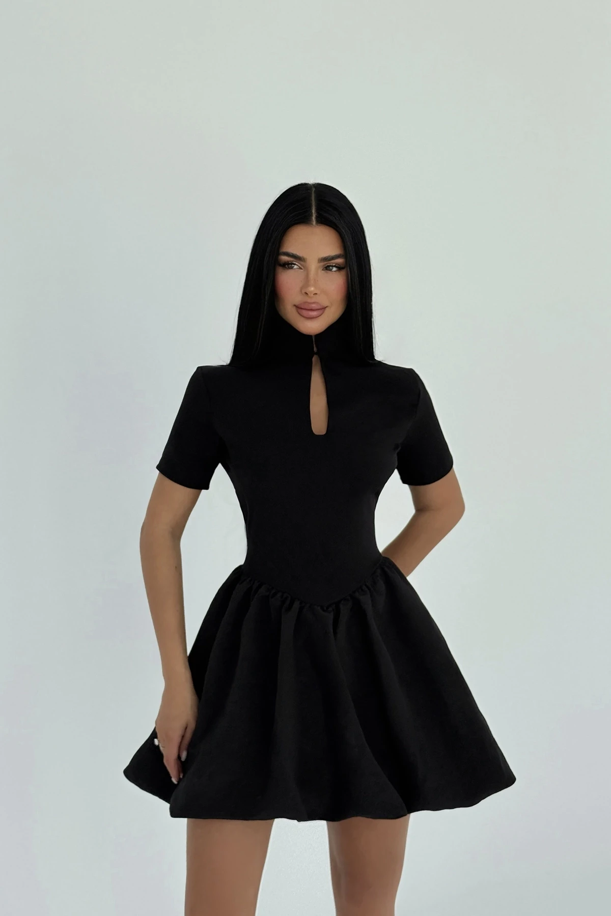 Black Window Detail Mini Dress XS size is used in the image. Made of Double-Cupra Fabric. Length: 87 cm Waist: 38 cm Chest: 43 cm Model Measurements Height 158 ​​Weight 52 Chest 80 Waist 62 Hip 93