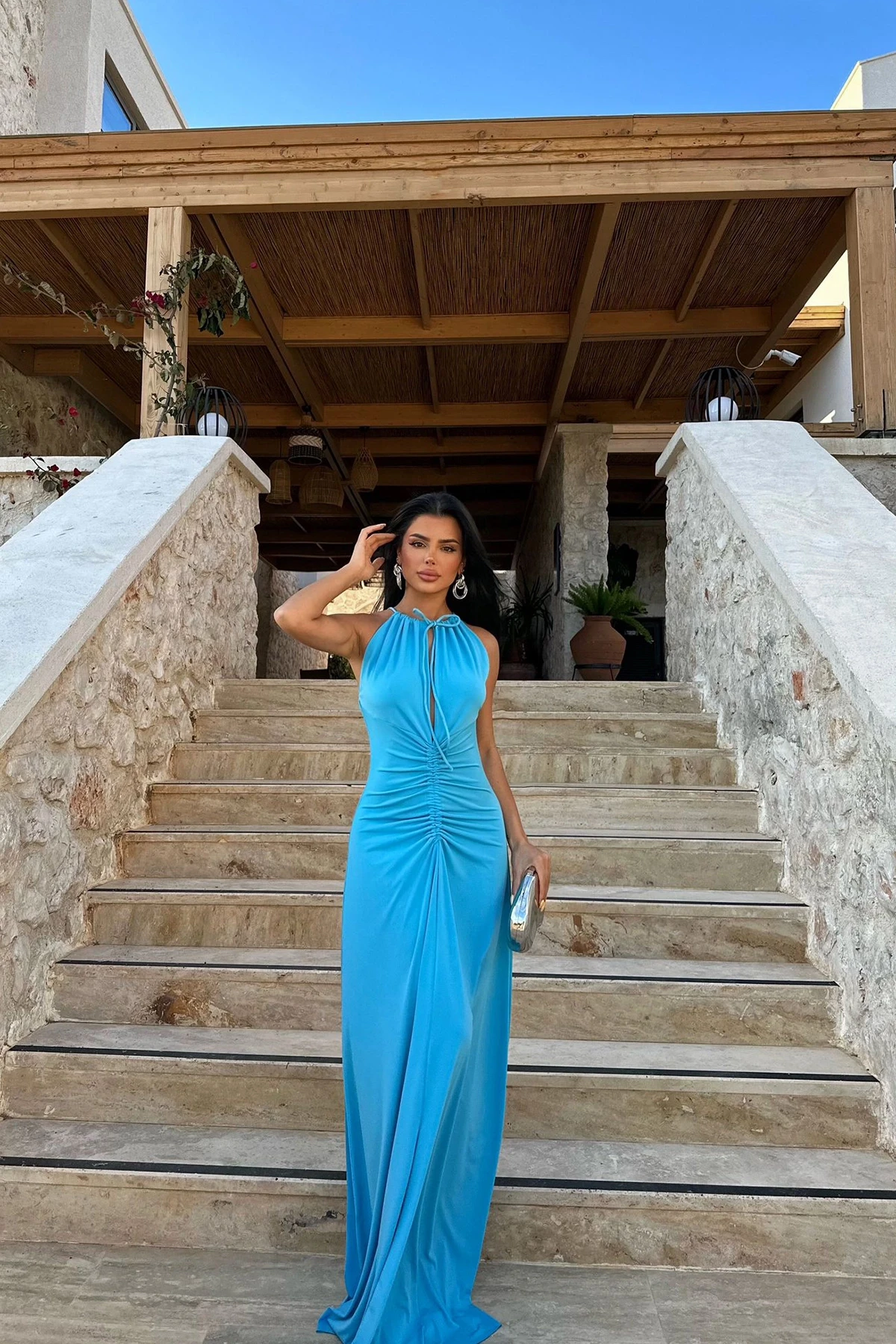 Blue Albertina Low-cut Long Dress Made of flexible fabric. Size S is used in the image. Dress Length: 155cm Chest: 37cm Waist: 32cm Model Measurements: Height: 160 Weight: 50 Chest: 80 Waist: 62 Hip: 94