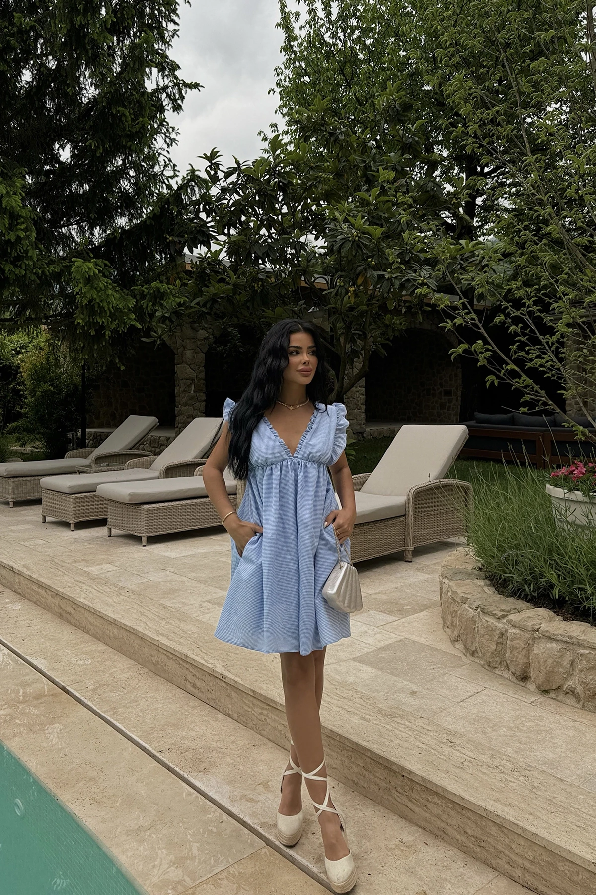 Blue Gingham Patterned Ruffle Mini Dress Made from poplin fabric Size S is used in the image Dress Length:83cm Bust:37cm Model Measurements: Height: 160 Weight: 50 Chest: 80 Waist: 62 Hip: 94