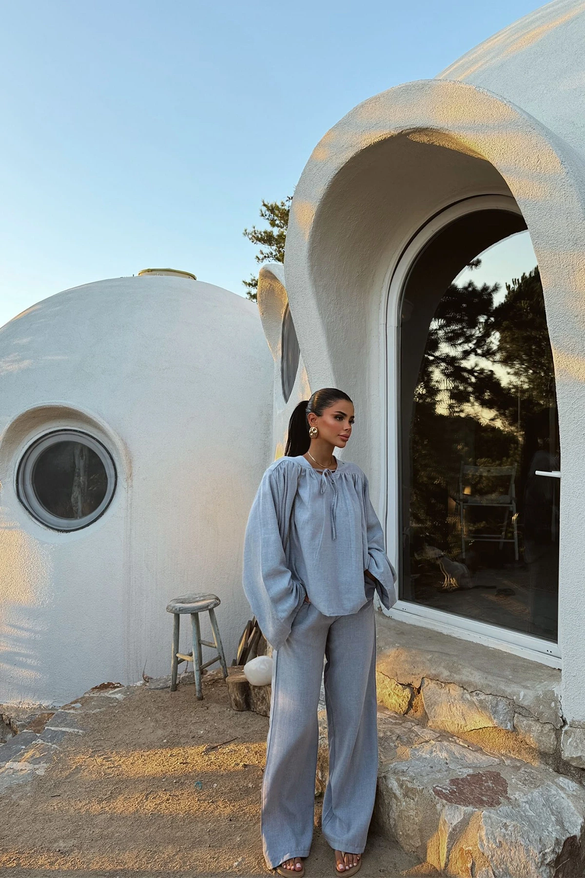 Blue Long Sleeve Linen Suit Made of linen fabric. S size is used in the image. Suit upper length 60 cm, Chest 80 cm, Bottom length 103 cm, Waist 42 cm Model Measurements Height: 160 Weight: 50 Chest: 80 Waist: 62 Hip: 94