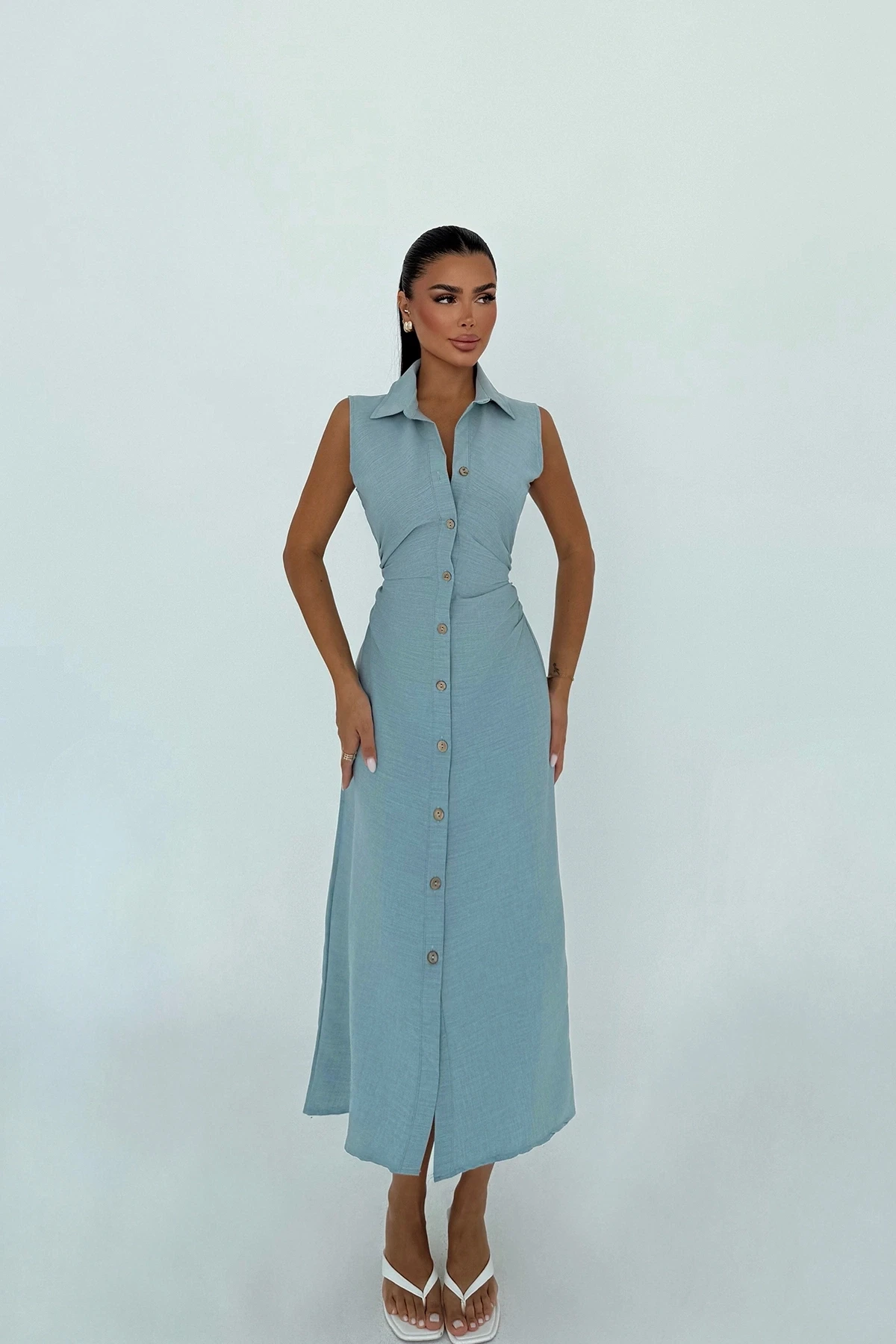 Blue Lyza Long Button-Down Dress The image shows size XS. Height: 120 cm, Waist: 35 cm, Chest: 42 cm Model Measurements: Height: 158 cm, Weight: 52 cm, Chest: 80 cm, Waist: 62 cm, Hips: 93 cm