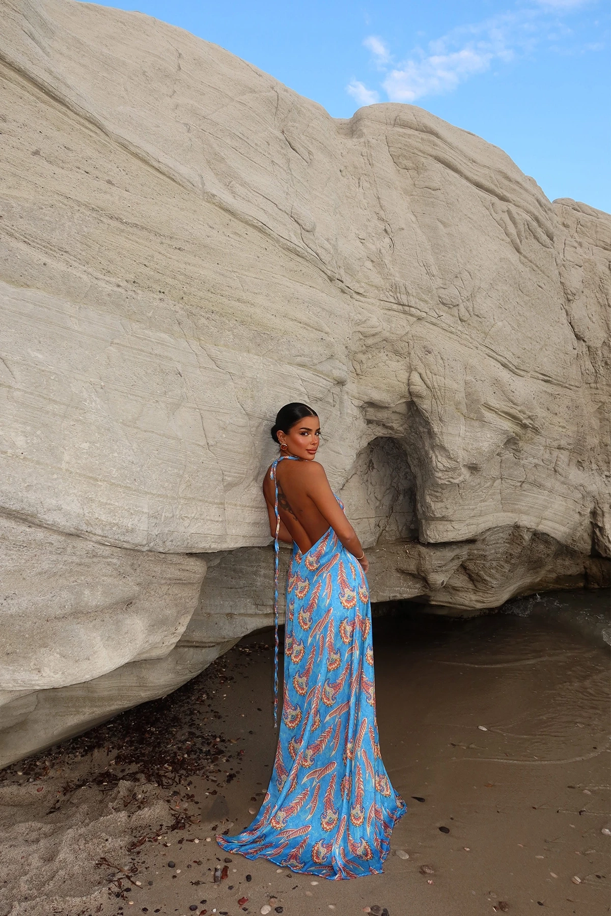 Blue Strappy Ethnic Pattern Long Dress XS size is used in the image. Dress length: 172 cm, Chest 38 cm Waist 48 cm Made of Satin Fabric. Model Measurements Height 158 Weight 52 Chest 80 Waist 62 Hip 93