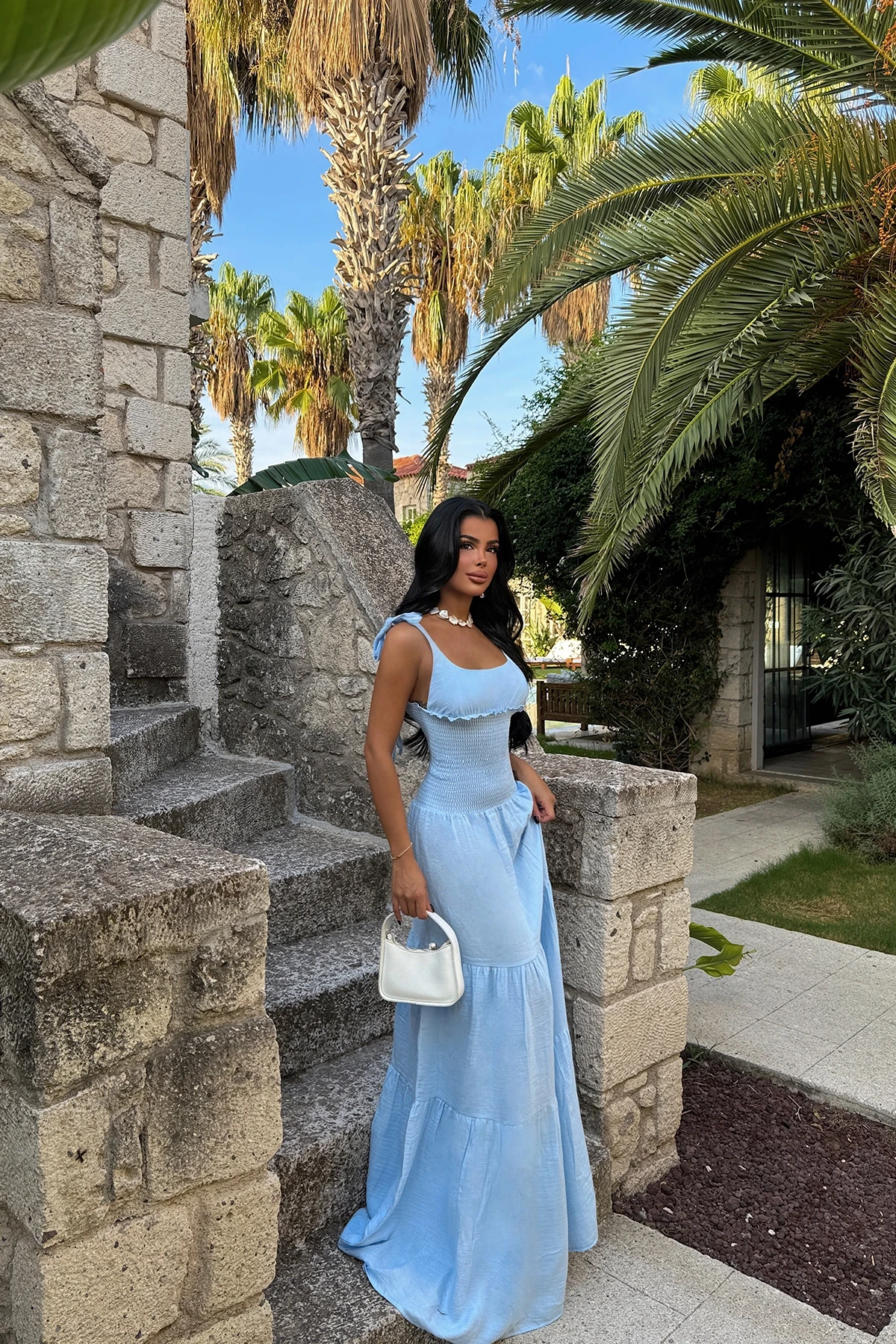 Blue Strappy Long Dress Size XS is used in the image. Made from muslin fabric. Dress Length: 145cm Bust: 30cm Waist: 27cm Model Measurements Height 158 Weight 52 Chest 80 Waist 62 Hip 93