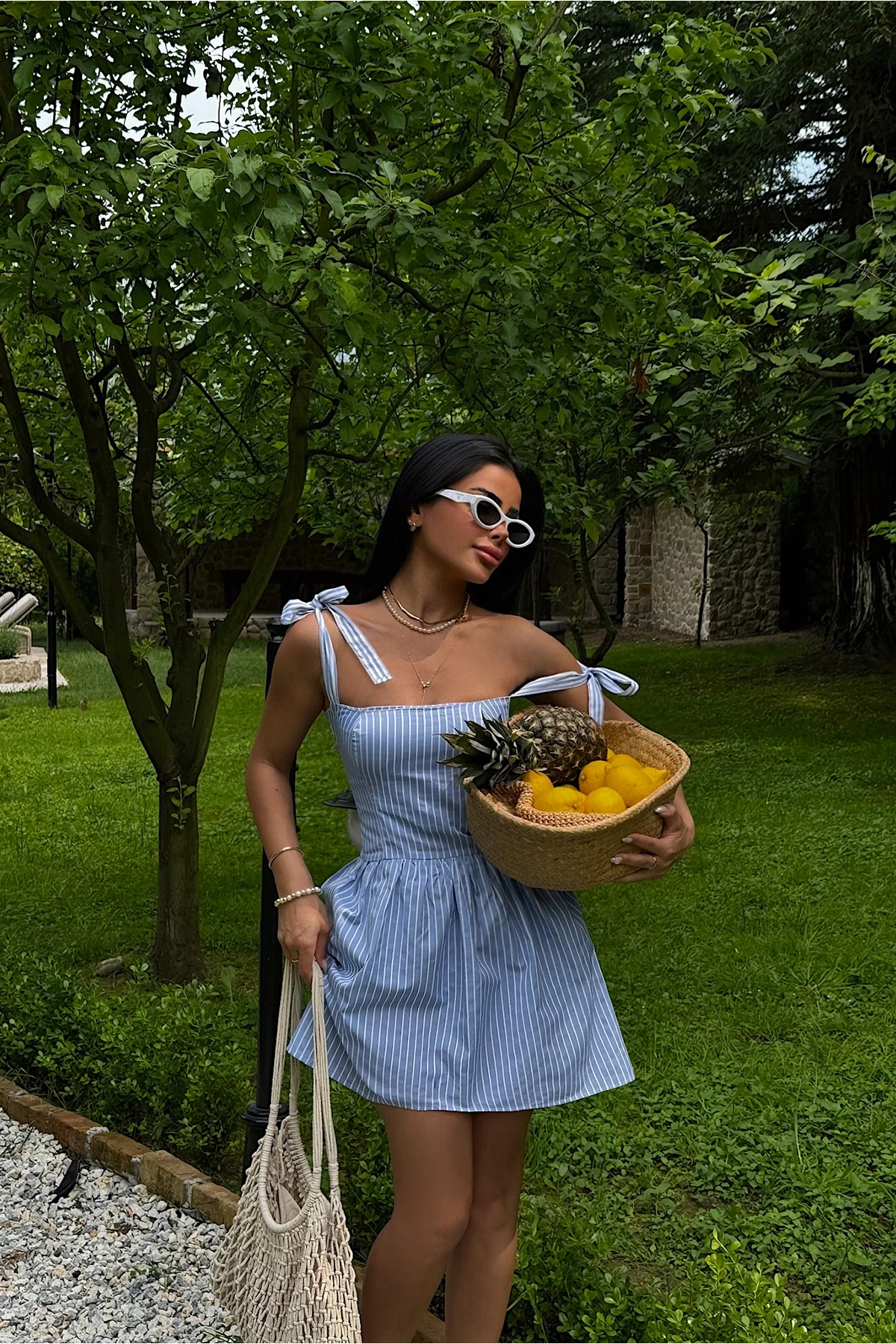 Blue Striped Mini Dress Size S is used in the image. The product has a zipper. Strap detail is adjustable. Made from Poplin Fabric Dress Length: 75cm, Chest: 37cm, Waist: 35cm Model Measurements: Height: 160 Weight: 50 Chest: 80 Waist: 62 Hip: 94