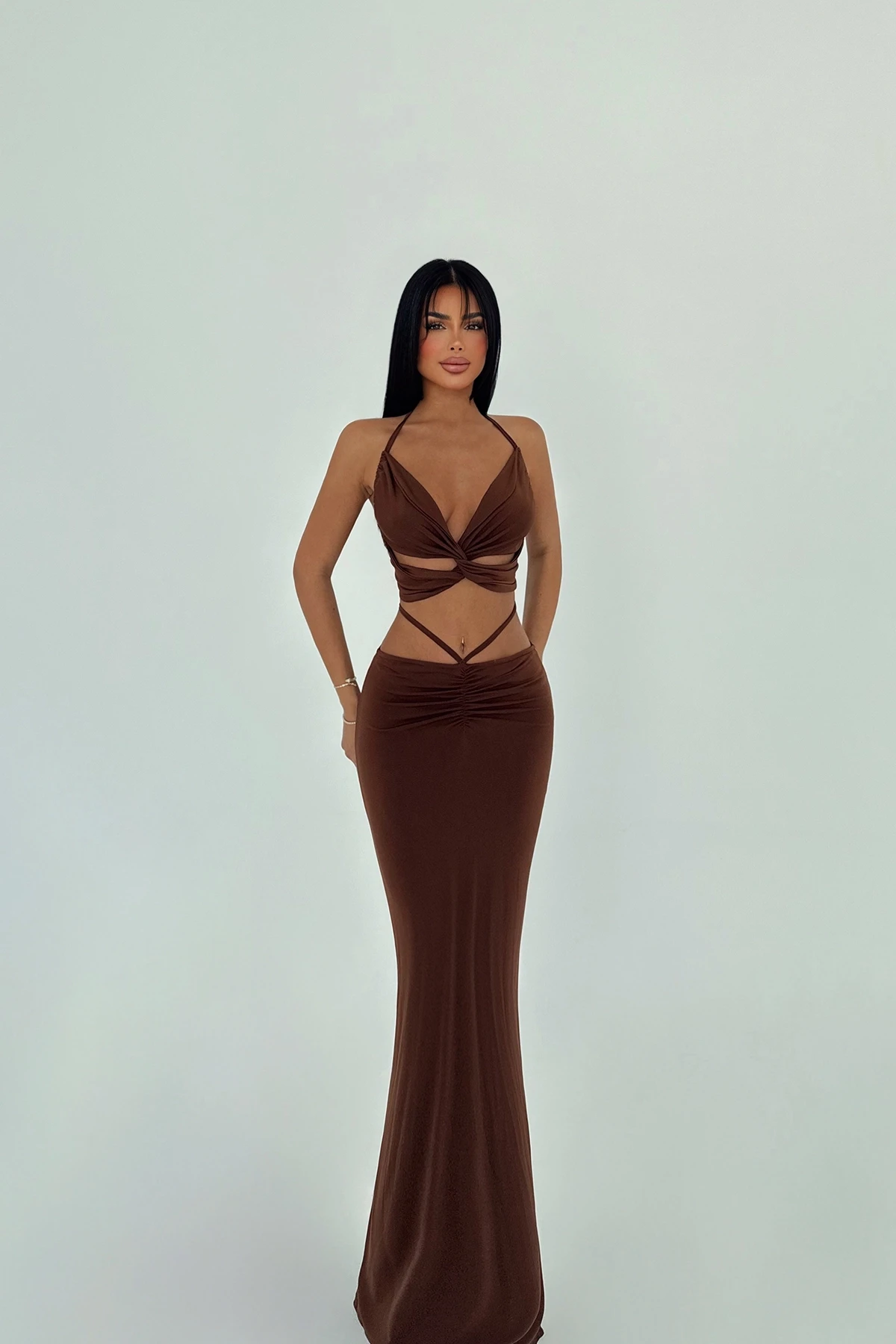 Brown Bianca Suit XS size is used in the image. Suit upper length 26 cm, Chest 38 cm, Bottom length 97 cm, Waist 36 cm Made of Sandy Fabric. Model Measurements Height 158 Weight 52 Chest 80 Waist 62 Hip 93