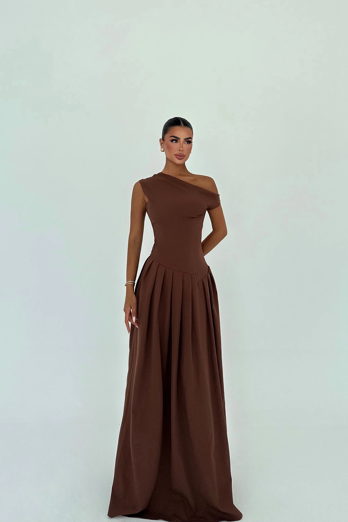 Brown Bimala Boat Neck Dress XS size is used in the image. Made of Begonia Fabric. Length: 148 cm Waist. 40 cm Chest: 37 cm Model Measurements Height 158 Weight 52 Chest 80 Waist 62 Hip 93