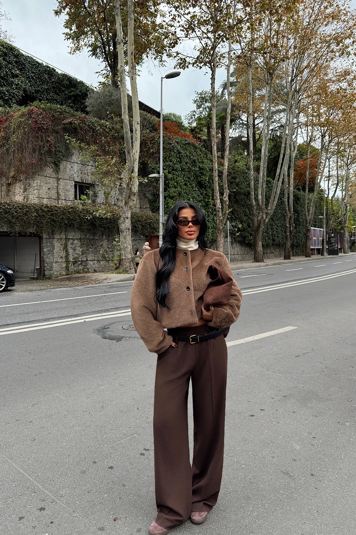 Brown Button Detail Jacket The image uses size XS. Height: 50 cm Chest: 54 cm Model Measurements Height 158 Weight 52 Chest 80 Waist 62 Hip 93