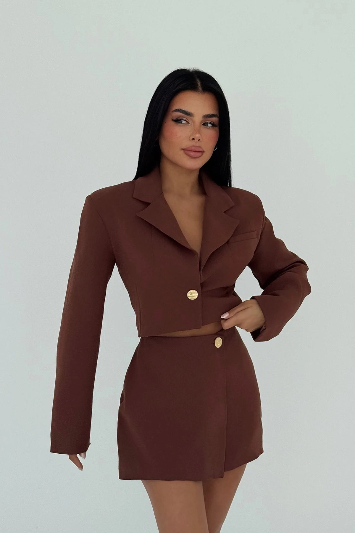 Brown Button Detail Skirt Suit XS size is used in the image. Top Length: 46 cm Chest: 51 cm Bottom Length: 35 cm Waist: 39 cm Model Measurements Height 158 Weight 52 Chest 80 Waist 62 Hip 93