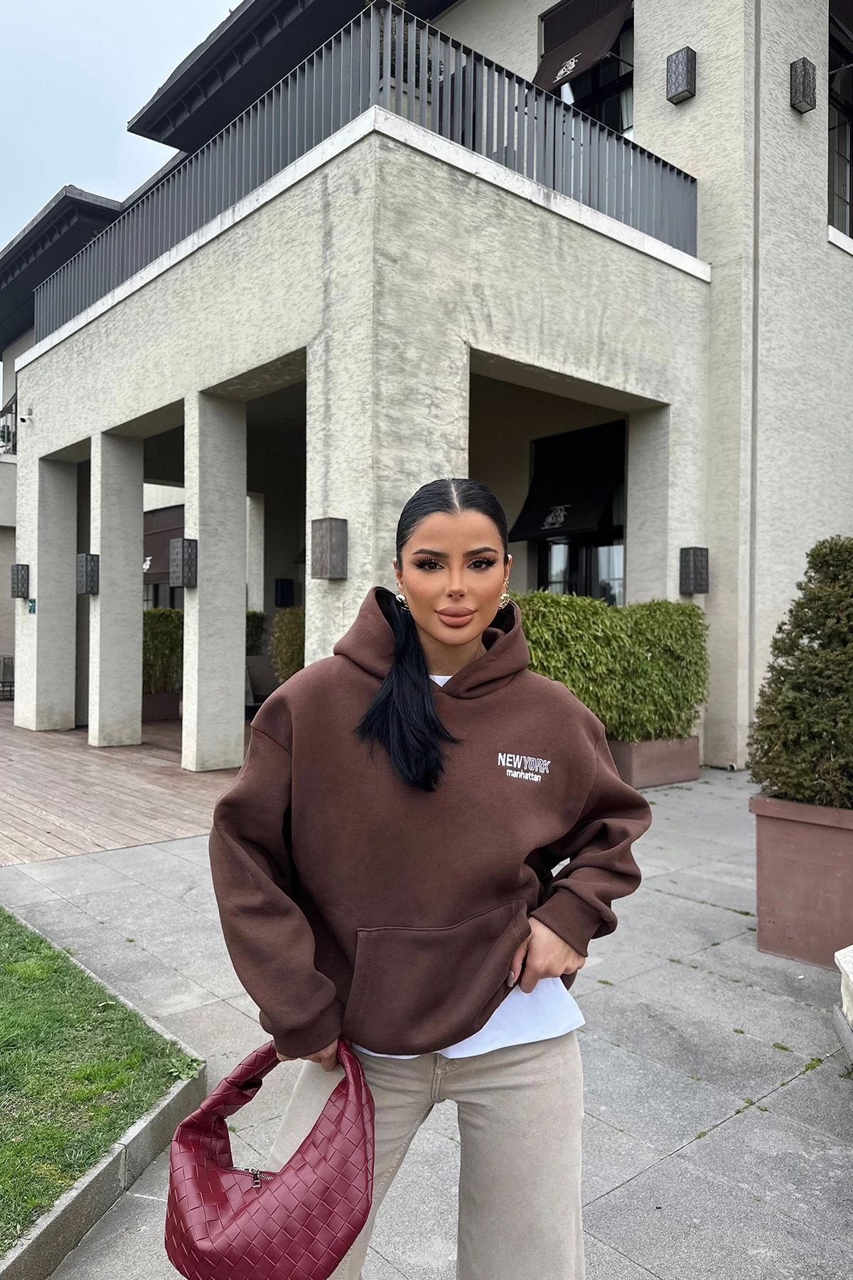 Brown New York  Hooded Sweat Made from Three Thread Fabric Size S is used in the image Sweat Length:63cm Chest:51cm Model Measurements: Height: 160 Weight: 50 Chest: 80 Waist: 62 Hip: 94