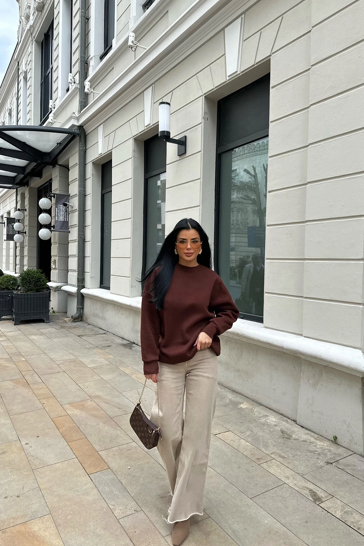 Brown Oversize Back Printed Sweat Made from Three Thread Fabric SSTD size is used in the image Sweat Length: 78 cm Chest: 60 cm Model Measurements: Height: 160 Weight: 50 Chest: 80 Waist: 62 Hip: 94