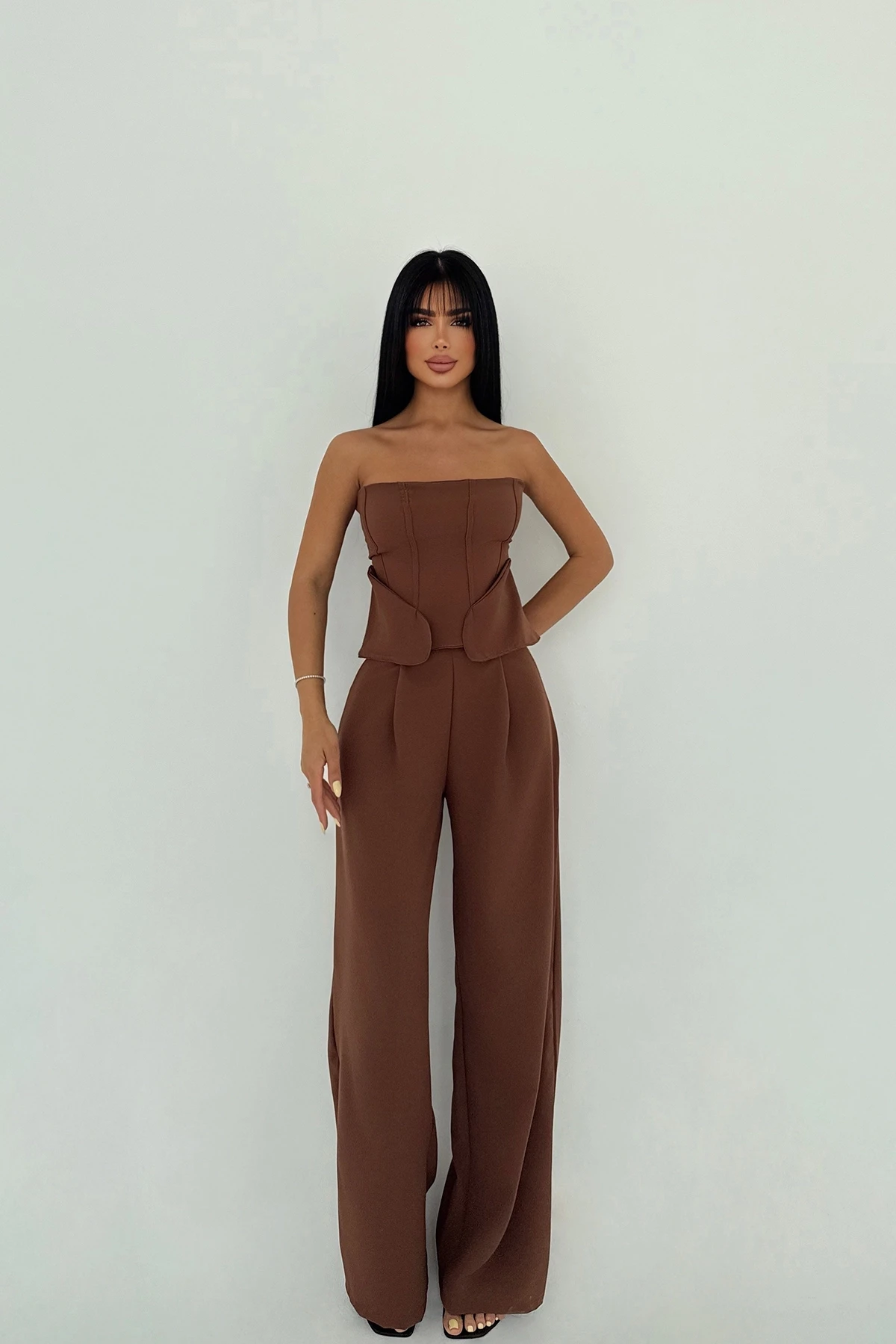 Brown Trouser Suit XS size is used in the image. Upper Length: 24 cm Chest: 38 cm Lower Length: 104 cm Waist: 36 cm Model Measurements Height: 160 Weight: 50 Chest: 80 Waist: 62 Hip: 94